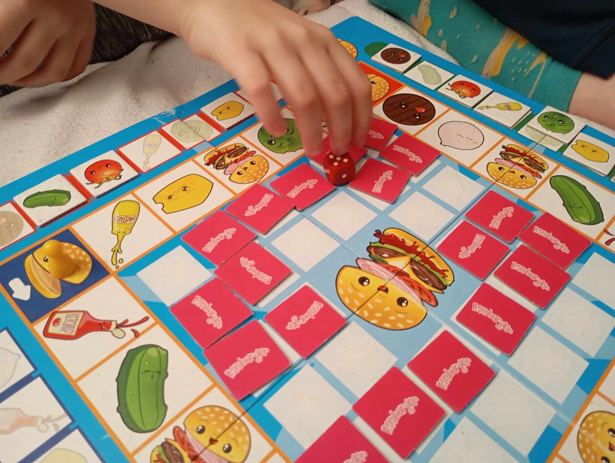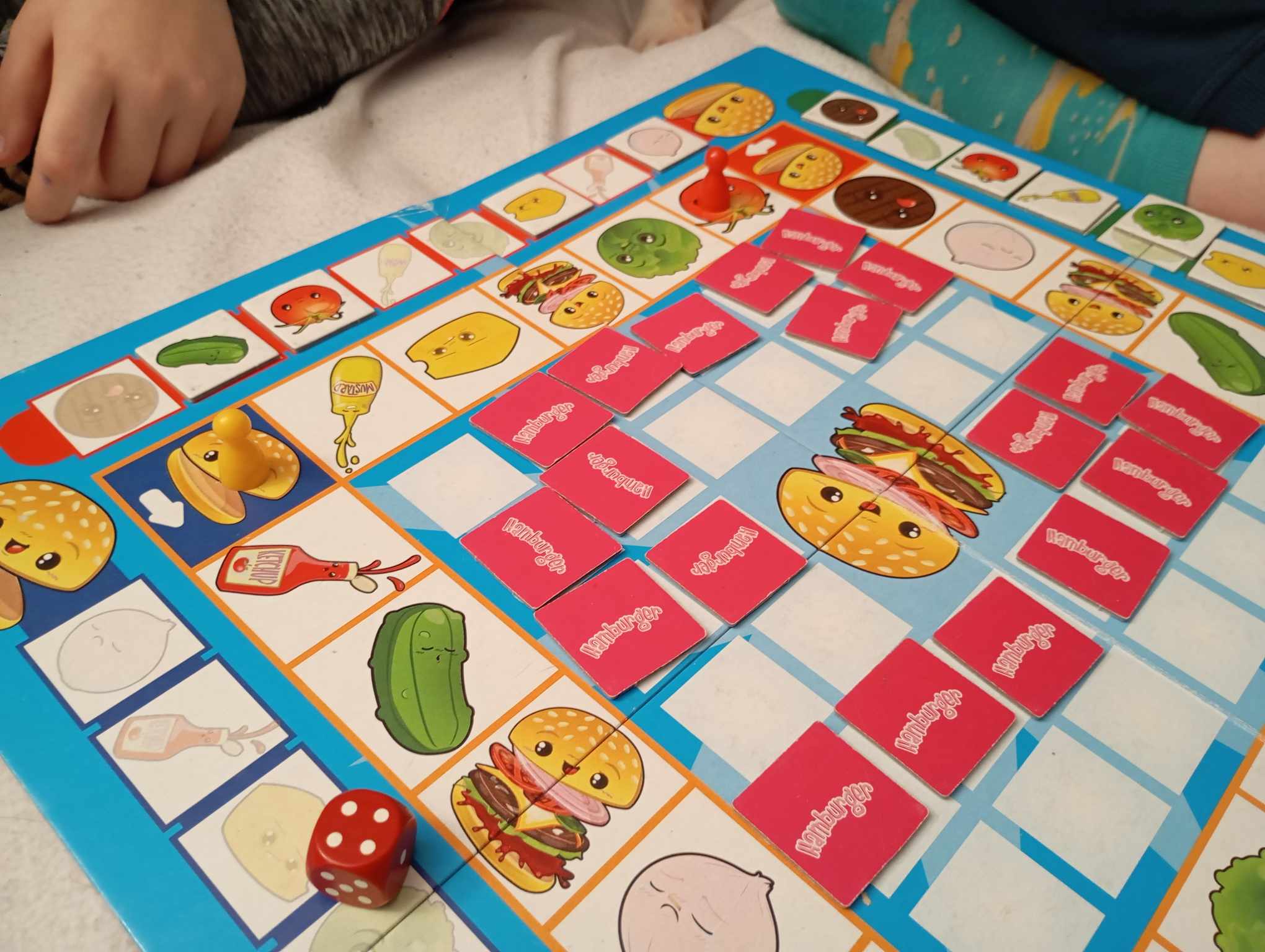 Desková hra, při níž si každý hráč musí vytvořit svůj hamburger. Nebojte se, nebudete s dětmi nic vařit. Doprostřed desky se dají jednotlivé ingredience – hořčice, kečup, maso, salát, cibule, sýr atd., a to obrázkem dolů tak, aby nikdo z hráčů nevěděl, kde co je. Poté se hází kostkou a hráči chodí s figurkou po políčkách kolem středu. Každé má nějakou ingredienci. Když si na ni hráč stoupne, musí právě tuto ingredienci najít pod obrácenými kartičkami. Mezi políčky ingrediencí jsou další – s hamburgery. Pokud na ně hráč šlápne, může říci libovolnou ingredienci, která mu chybí, a pro tu si pak sáhnout – pokud tedy ví, kde ji hledat.