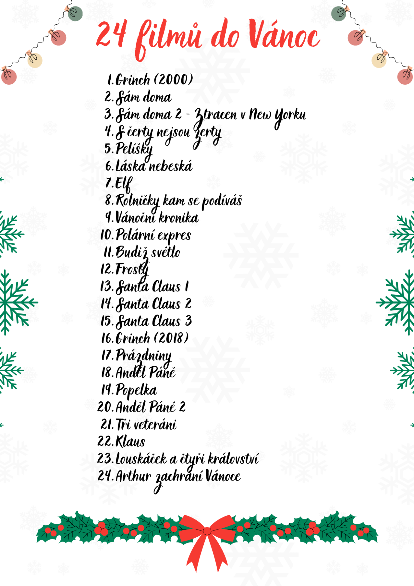 Grinch, Sám doma, Sám doma 2, Elf, Rolničky, kam se podíváš, Vánoční kronika, Budiž světlo, Frosty, Santa Claus 1-3, Klaus, Louskáček a čtyři království, S čerty nejsou žerty, Polární expres, Grinch (2018), Anděl Páně 1-2, Popelka, Tři veteráni, Arthur zachrání Vánoce, Pelíšky, Láska nebeská, Prázdniny.