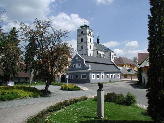 Nejvýznamnější památka kterou postavil v letech 1590 – 1596 snad Petr Vlach. Na počátku 18. století zbořeny kaple nesoucí empory, r. 1828 snížena věž, r. 1885 se zřítila klenba lodi, v letech 1936–1940 byla nahrazena novou ze železobetonu. V kostele je cenné vnitřní zařízení, mj. sochy z dílny J. Jelínka. Barokní děkanství se štíty z doby kolem r. 1700.