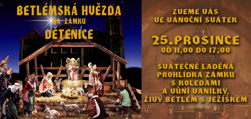 Na první svátek vánoční jsme pro celou Vaši rodinu připravili na zámku v Dětenicích speciální program, který vánoční atmosféru ještě znásobí. Přímo v komnatách zámku uvidíte živý betlém s malým Ježíškem a duši pohladí také koledy, které k vánocům neodmyslitelně patří. Zámek bude provoněný vanilkovým aroma a celá sváteční prohlídka Vám umožní strávit nezapomenutelné chvíle po boku Vaší rodiny. „Vánoční svátky mají nevšední nádech a vánoce v zámku toto kouzlo ještě umocňují, proto jsme se rozhodli uspořádat sváteční prohlídku zámku pro všechny, kteří si chtějí vánoční atmosféru užít a vychutnat,“ říká Petr Jindrák, ředitel Zámeckého resortu Dětenice.