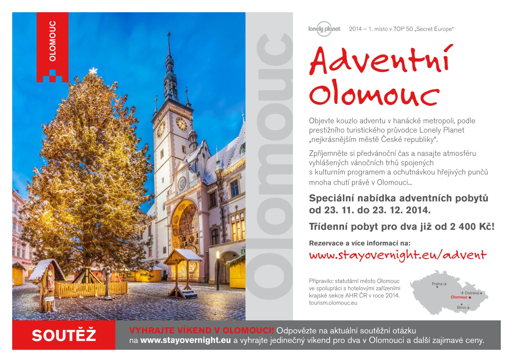 Tak neváhejte a využijte speciálních třídenních adventních pobytů pro dvě osoby v místních hotelech a penzionech za zvýhodněné ceny! Tato nabídka platí od 23. listopadu do 23. prosince 2014 a připravilo ji statutární město Olomouc ve spolupráci s hotelovými zařízeními krajské sekce Asociace hotelů a restaurací České republiky. Podrobnější informace a možnost rezervace pobytů naleznete na www.stayovernight.eu/advent.