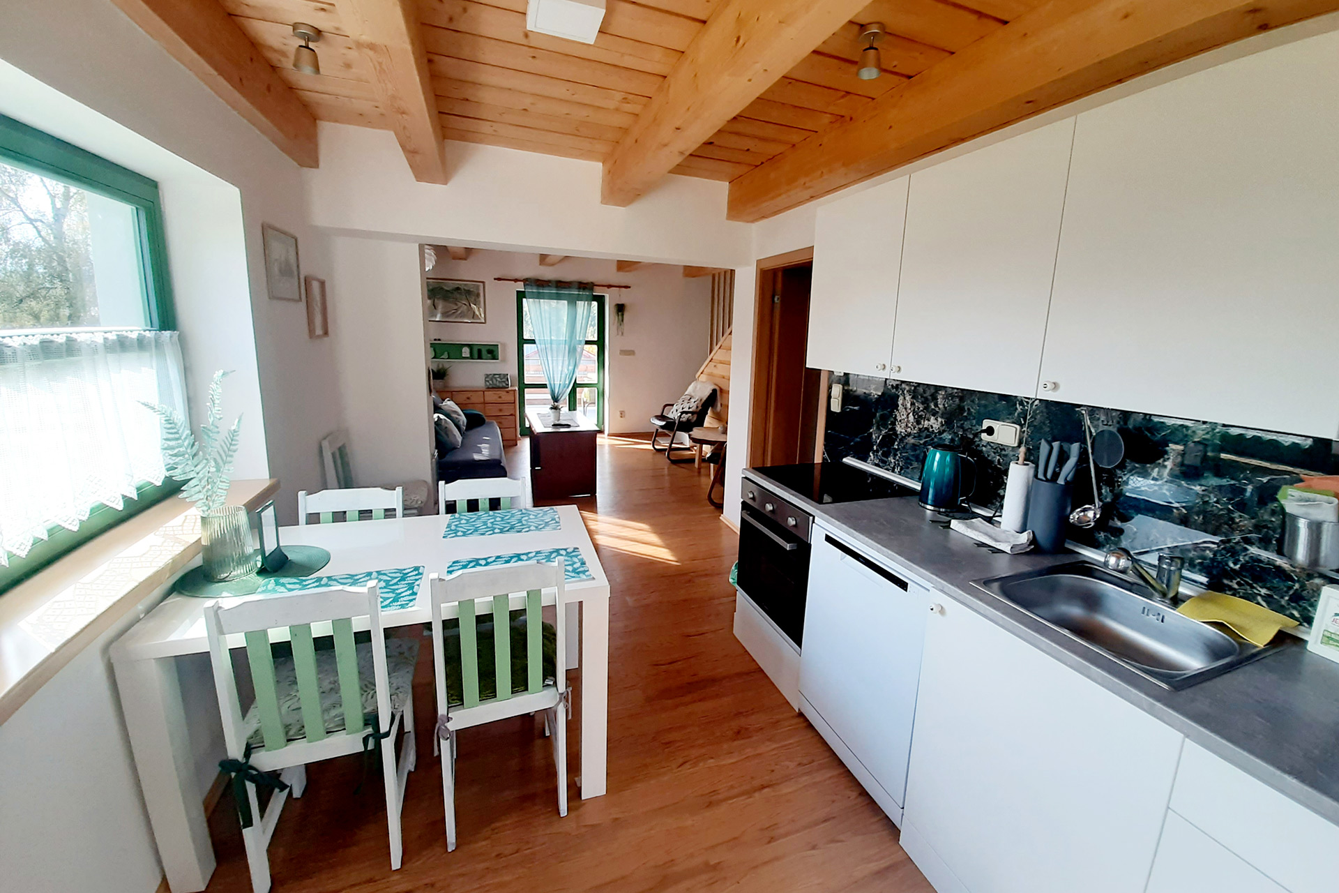 Menší apartmán je ideální volbou pro 4 až 6 osob a rozkládá se ve dvou podlažích. Součástí je vlastní garáž s úložným prostorem, v prvním patře je plně vybavená kuchyň, jídelna, obývací část, terasa a koupelna se sprchovým koutem. V horním patře se nacházejí dvě pohodlné ložnice a druhá koupelna, takže ubytování nabízí dostatek soukromí i pro vícečlennou rodinu nebo dvě dvojice.
