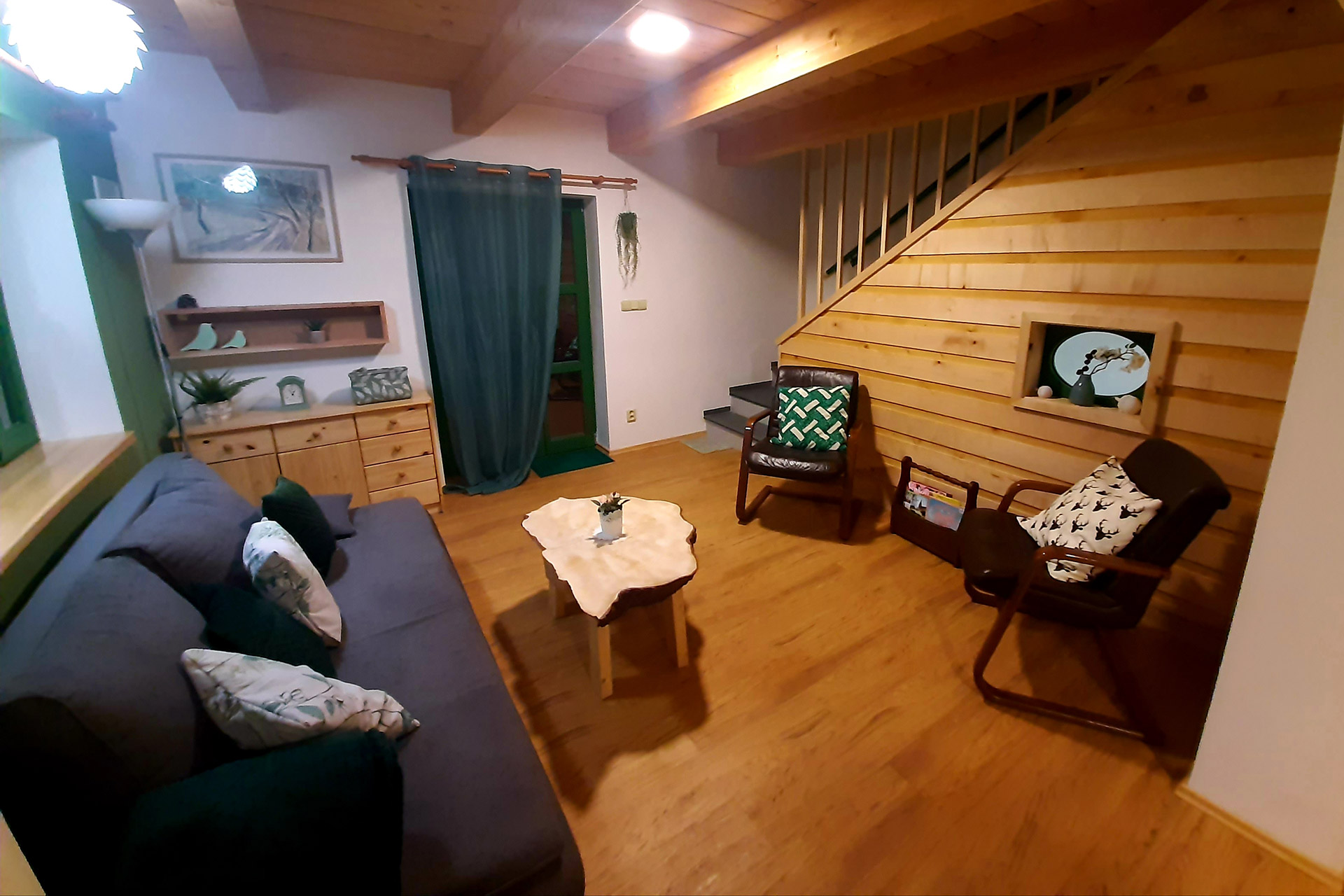 Oba apartmány mají přímý přístup na společnou zadní terasu, která vede do rozlehlé zahrady s ohništěm a zahradním domkem. Jde o příjemné místo pro letní večery, chvíle odpočinku i posezení s rodinou či přáteli po výletech nebo lyžování.