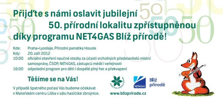 Program NET4GAS Blíž přírodě Vám již šestým rokem zpřístupňuje přírodně zajímavé a cenné lokality společně s Českým svazem ochránců přírody. Dne 20. září 2012 otevře jubilejní padesátou! Kde? V Praze-Lysolajích, v lokalitě přírodní památka Housle v přírodním parku Šárka-Lysolaje. Kdy? Od 10 hodin proběhne oficiální otevření lokality, od 16 hodin pak bude připraven program pro děti a dospělé plný her, soutěží a překvapení, jak jinak, zejména s tématikou přírody a její ochrany.