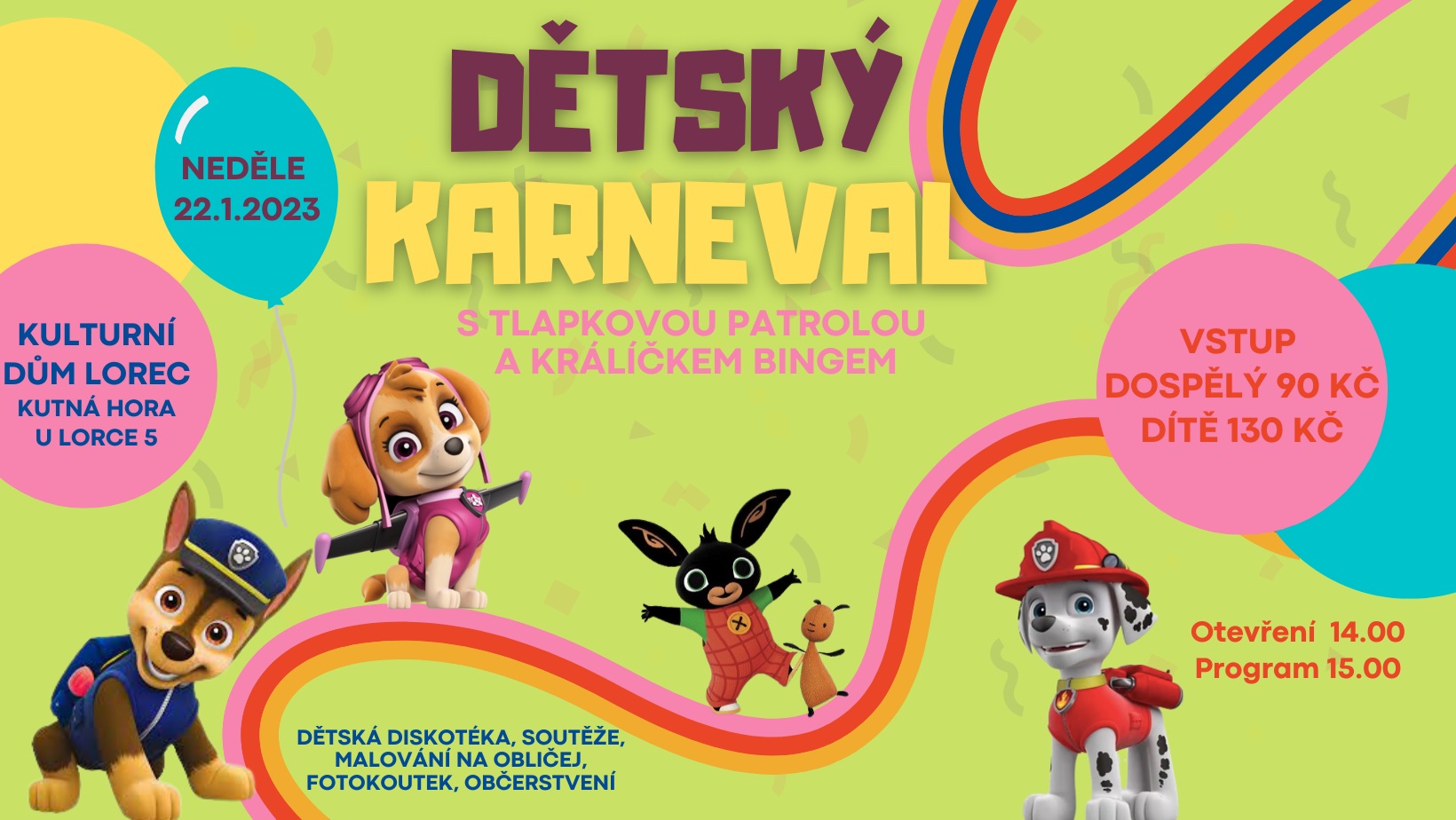 Rádi bychom Vás pozvali dne 22.1.2023 na DĚTSKÝ KARNEVAL v KUTNÉ HOŘE (Kulturní dům Lorec).