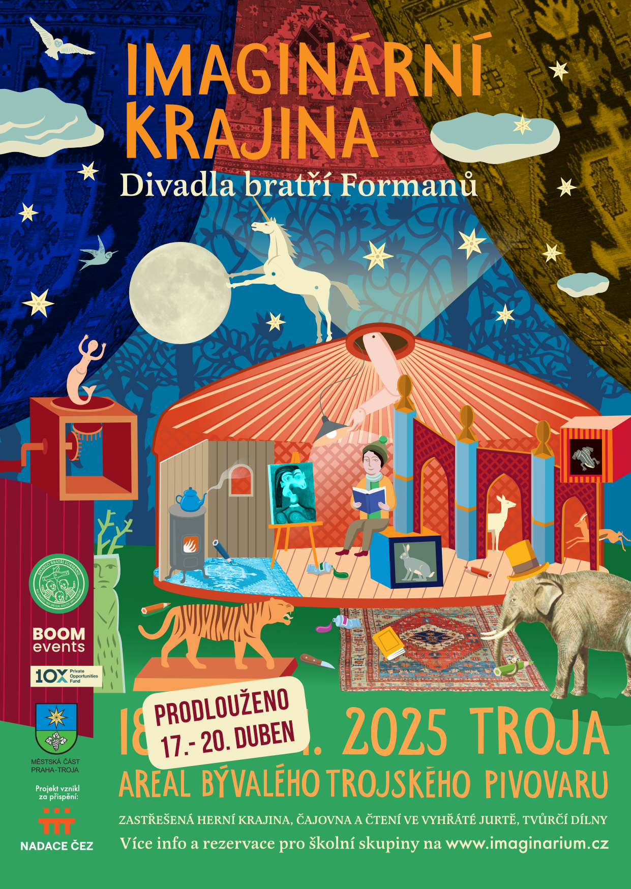 Imaginární krajina Divadla bratří Formanů v Trojském pivovaru se prodlužuje. Kromě původně plánovaného víkendu 12. a 13. dubna, bude výstava pro veřejnost otevřena i ve sváteční velikonoční dny od čtvrtka 17. do neděle 20. dubna vždy od 10 do 18 hodin.
