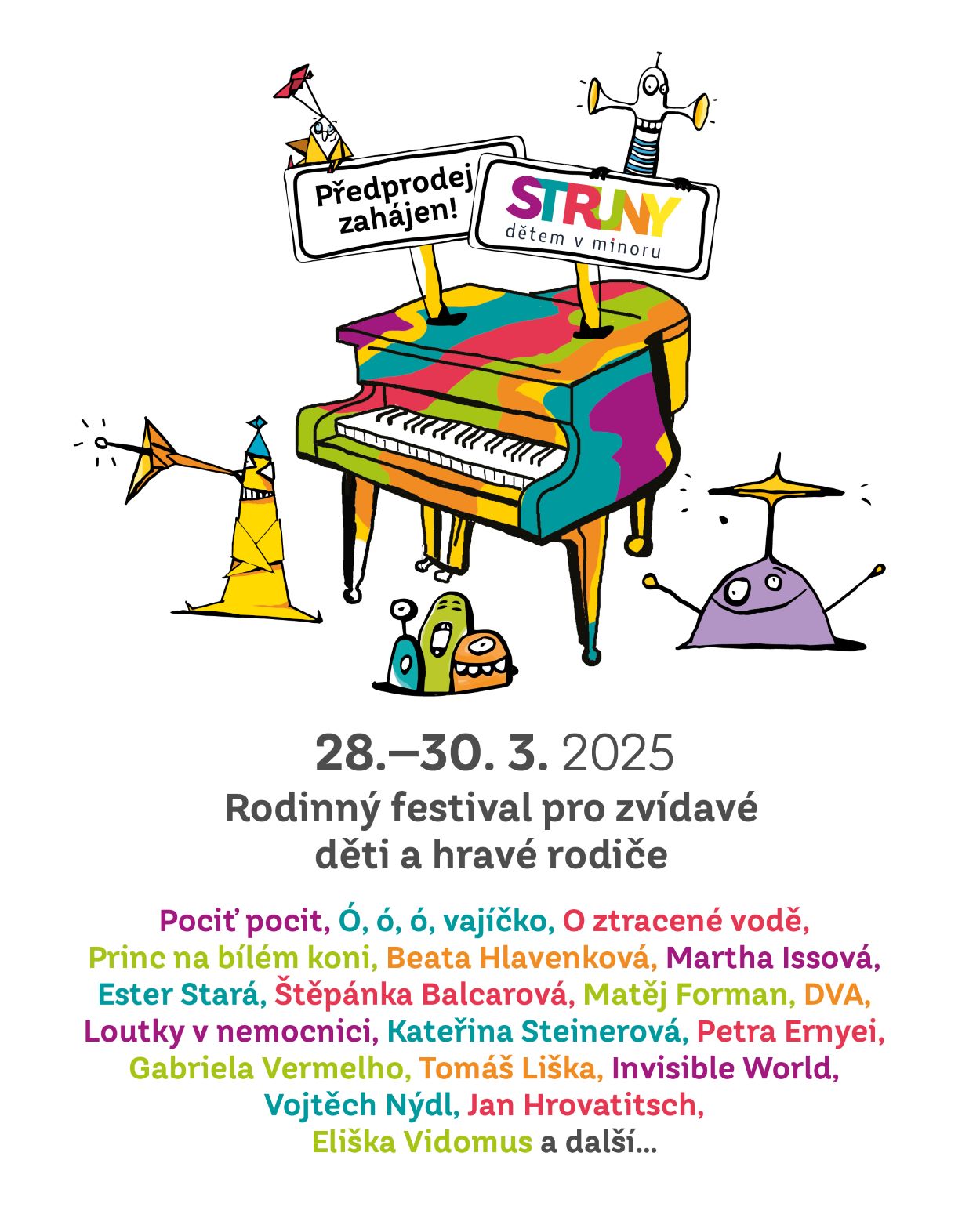 Festival Struny dětem v Minoru zveřejňuje program a zahajuje předprodej vstupenek 16. ročníku. O víkendu 28. až 30. března opět zaplní divadlo Minor koncerty nejrůznějších žánrů, divadlem i tancem. Láká například na koncerty originální multižánrové skupiny DVA, Tomáše Lišky s kapelou Invisible World, kteří neotřele kombinují jazz a world music a jejich tvorbu vizuálně doplňují projekce Lindy Arbanové či táborákové písničky v podání Kateřiny Steinerové a Martina Adamovského. Kdo si rád zpívá v koupelně ocení koncert zpěvaček a komediantek Petry Ernyei a Mirky Novak. Program nabízí i křehké písně klarinetisty Vojtěcha Nýdla nebo interaktivní koncert houslistky a zpěvačky Gabriely Vermelho a tanečnice Anny Homoly.