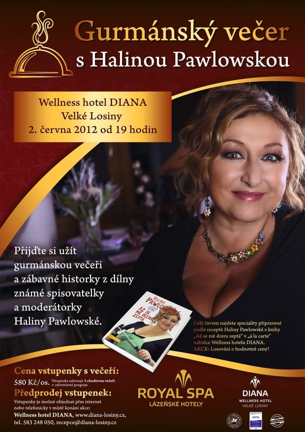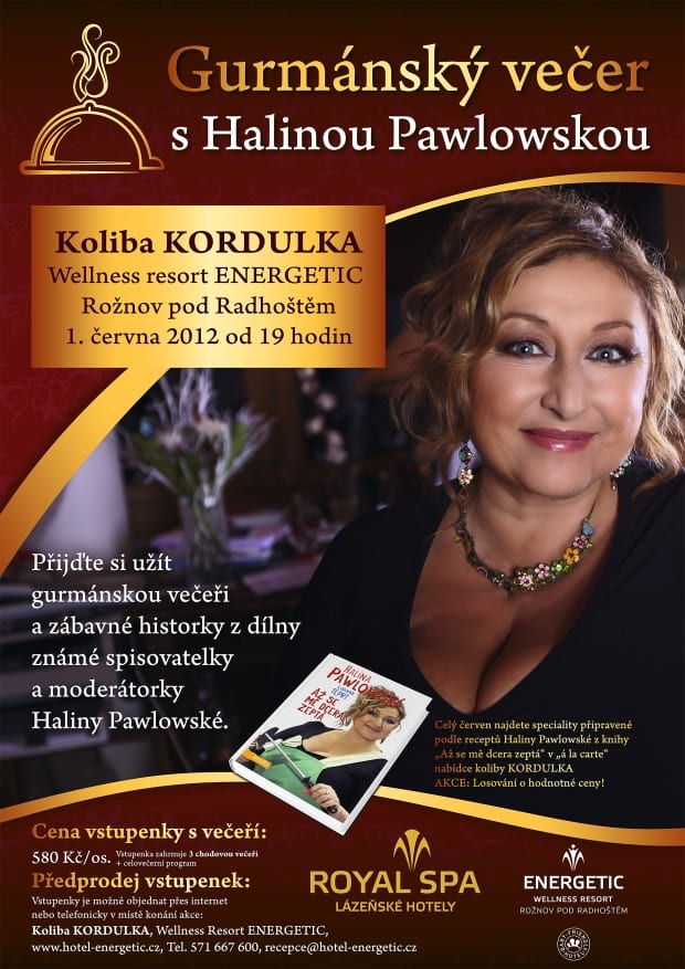 Přijďte si užít gurmánskou večeři provázenou zábavnými historkami z dílny spisovatelky a moderátorky Haliny Pawlowské. Bude se konat ve dnech 1. června v Kolibě Kordulka ve Wellness resortu ENERGETIC v Rožnově pod Radhoštěm a 2. června ve Wellness hotelu Diana ve Velkých Losinách. Po celý večer budete moci ochutnávat jídla připravená podle originálních receptů, které se v rodině známé publicistky předávají z generace na generaci a patří v její kuchyni k těm nejoblíbenějším. Gurmánské hody o třech chodech s celovečerním programem začínají vždy v 19. hodin. Bližší informace najdete na stránkách www.hotel-energetic.cz a www.diana-losiny.cz.
