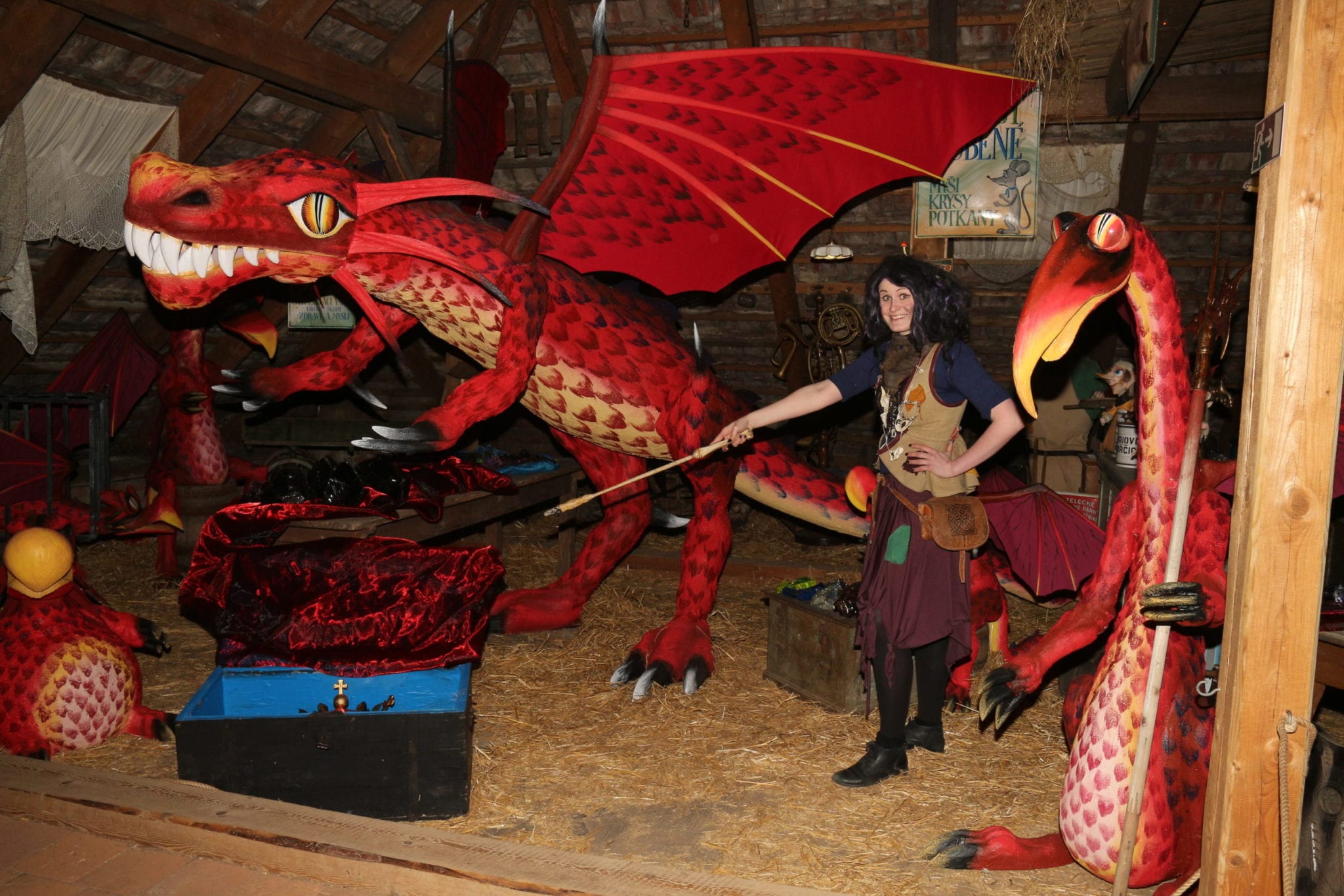 Na HRADNÍ POHÁDKOVÉ PŮDĚ vás čeká lekce čarodějného létání na koštěti, a kromě čarodějnic a skřítků i strážci velkého dračího pokladu – Obří rubínoví draci.