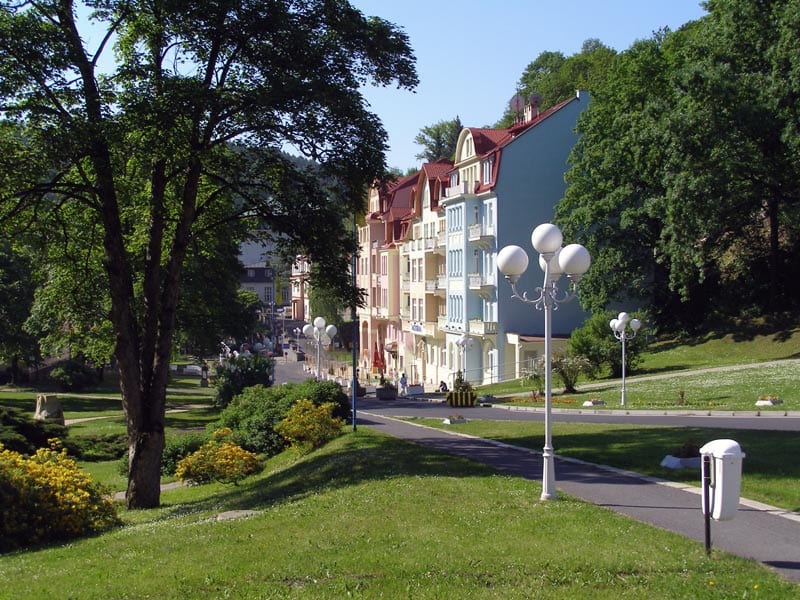 Na křižovatce v lázních se protíná se žlutou, u radnice se zelenou.