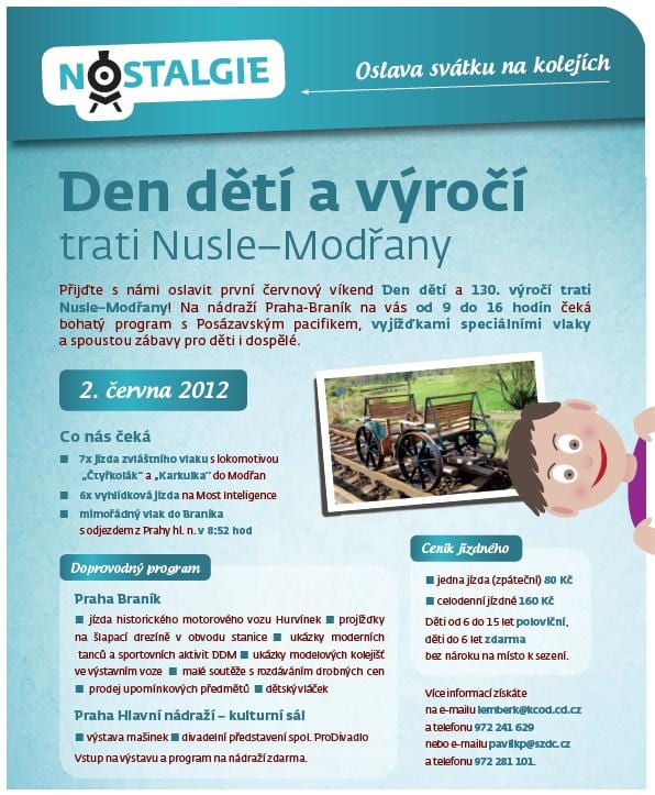 ¨Přijďte s námi oslavit první červnový víkend Den dětí a 130. výročí trati Nusle–Modřany! Na nádraží Praha-Braník na vás od 9 do 16 hodin čeká bohatý program s Posázavským pacifikem, vyjížďkami speciálními vlaky a spoustou zábavy pro děti i dospělé. Co nás čeká: 7x jízda zvláštního vlaku s lokomotivou „Čtyřkolák“ a „Karkulka“ do Modřan, 6x vyhlídková jízda na Most Inteligence, mimořádný vlak do Braníka s odjezdem z Prahy hl. n. v 8:52 hod.