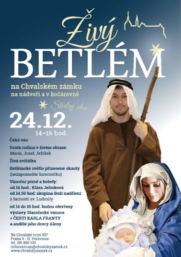 Štědrý den můžete strávit na Chvalském zámku, kde se od 14 do 16 hodin koná tradiční živý betlém. Na nádvoří zazní vánoční písně v podání mladé zpěvačky Magdaleny Moudré a skupiny Boží nadělení. V kočárovně vás přivítá Svatá rodina – Marie, Josef a malý Ježíšek. Spolu s živými zvířátky, se kterými si děti mohou pohrát. Přineste si lucerničku a odneste si domů pravé betlémské světlo, které doručili skauti. Pro návštěvníky budou otevřeny i dvě vánoční výstavy. Vstup na nádvoří a do kočárovny je zdarma, na výstavy platí běžné vstupné.