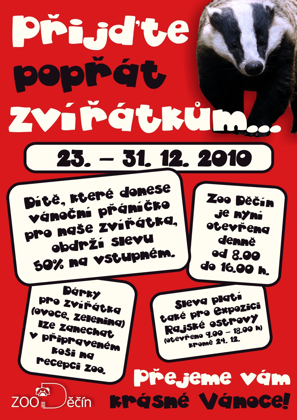 Děčínská zoo pro vás na nejbližší dny připravila malý vánoční dárek pro děti. Každé dítě, které do zoo donese vlastnoručně vyrobené vánoční přáníčko pro zvířata, dostane za odměnu vstup jen za polovic. Akce platí jak pro zoo na Pastýřské stěně, tak i v Expozici Rajské ostrovy. Kdo se do zoo vydá, může přinést zvířatům i nějakou dobrotu. Na recepcích budou připraveny koše, do kterých bude možné vkládat dárky pro zvířata jako je ovoce, zelenina, tvrdé pečivo nebo obilniny. Akce trvá od středy 23. do pátku 31. prosince.