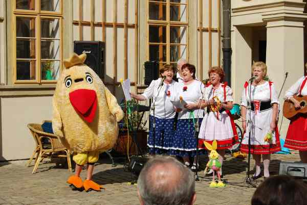 Program začíná v 9.30 hodin, kdy se otevře řemeslné tržiště a začne vyhrávat country kapela Balzám. Kolem 10.00 hodiny jsou v zámecké zahradě připraveny Pašijové hry a čtení z Bible. Na nádvoří začnou šermířské souboje a bitky. Skupina Alotrium přiveze bojechtivé muže, kteří budou dobývat vaše srdce. „Uvidíte originální zpracování Tří mušketýrů a dozvíte se, jak to bylo s mušketýry doopravdy. Pak nastoupí Piráti z Karibiku. Děti se vydovádí při rytířských hrách a mohou se vyfotografovat v historickém kostýmu. Pro náročnější je přichystána veselá přednáška o historických zbraních,“ říká Josef Kutílek hlavní vedoucí skupiny historického šermu Alotrium. Připraveno je také divadlo, výtvarný ateliér s tématem Velikonoc a nemůže chybět velikonoční prohlídka pro rodiny s dětmi. „Velikonoční veselice je tradiční akce, která chce pobavit, ale také připomenout, proč se vlastně Velikonoce slaví. Chtěli jsme podpořit nějaký charitativní projekt a vybrali jsme si „Pomozte dětem“, jenž pomáhá znevýhodněným dětem,“ uvádí kastelánka Jana Digrinová. Dále si můžete zajezdit na koni, namalovat veselé zvířátko na obličej nebo se podívat na 70 panenek v historických kostýmech. Program končí po 16.00 hodině.
