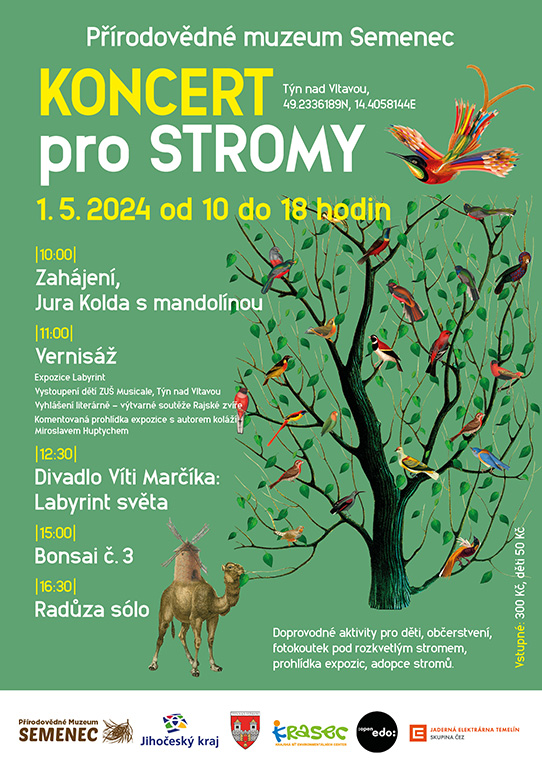 „Dopoledne bude velice zajímavé, od 11:00 proběhne vernisáž a komentovaná prohlídka expozice s autorem koláží Miroslavem Huptychem, který vyhlásí soutěž pro děti – Rajské zvíře. Poté naváže v 12:30 představení Labyrint světa Víti Marčíka – osobitá interpretace Komenského díla (divadlo je tentokrát 80 minut dlouhé, takže paralelně s ním bude probíhat dětská zábavná prohlídka s lektorkou), Hlavní hudební program začíná od 15:00 – budějovická Bonsai č. 3 a pražská Radůza, kterou není třeba představovat. „ popisuje Šímová a dodává: „Věřím, že letošní program Koncertu pro stromy osloví milovníky hudby, výtvarného umění, filozofie i přírody a poskytne návštěvníkům inspiraci a radost na jejich vlastní pouti labyrintem světa. Srdečně zveme všechny návštěvníky 1. května od 10:00 hodin.