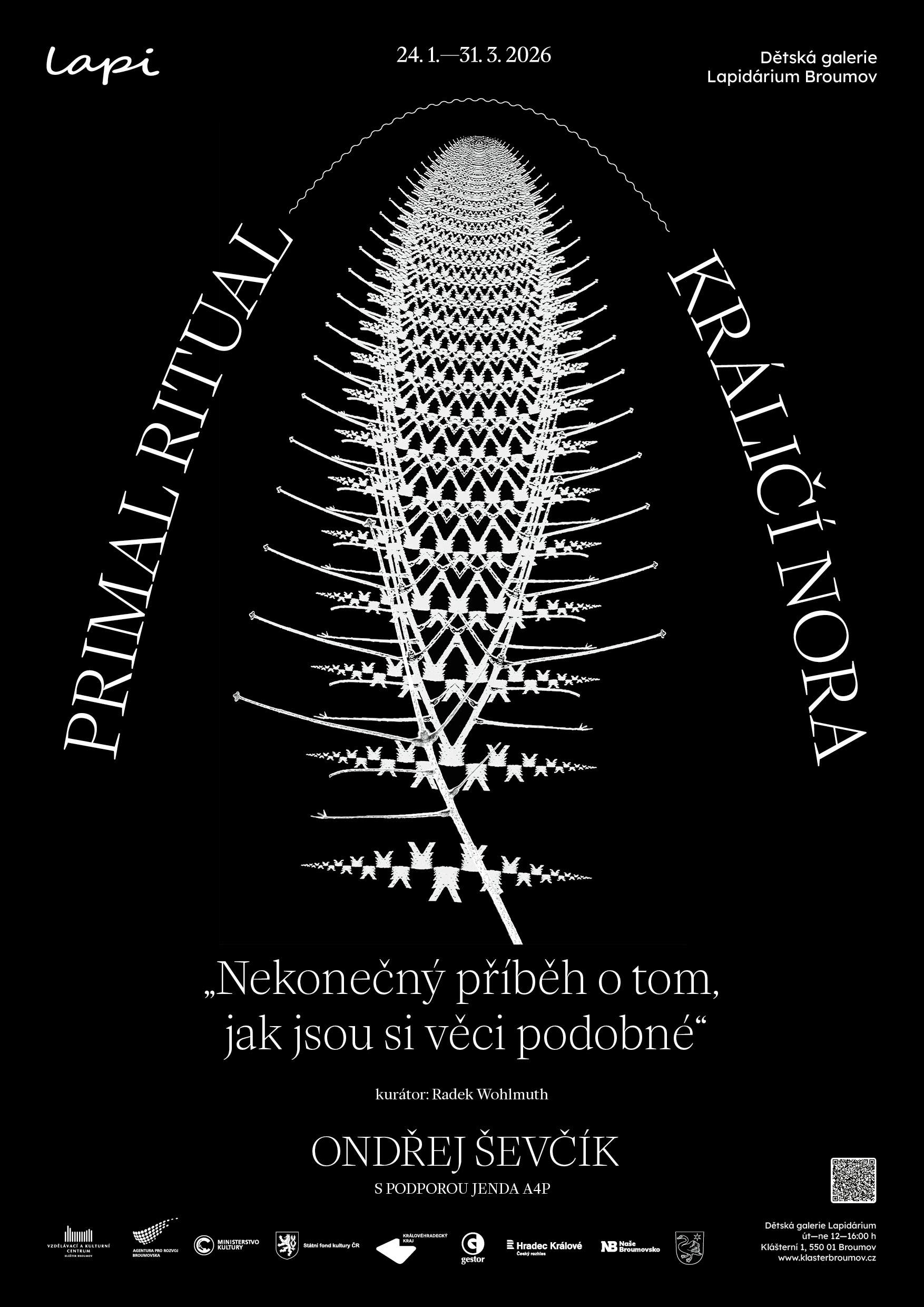 Výstava Primal Ritual – Králičí nora je otevřena od 24. ledna do 31. března a najdete ji v areálu broumovského kláštera. Galerie je přístupná od úterý do neděle v odpoledních hodinách, mimo běžnou otevírací dobu je možné domluvit návštěvu individuálně.