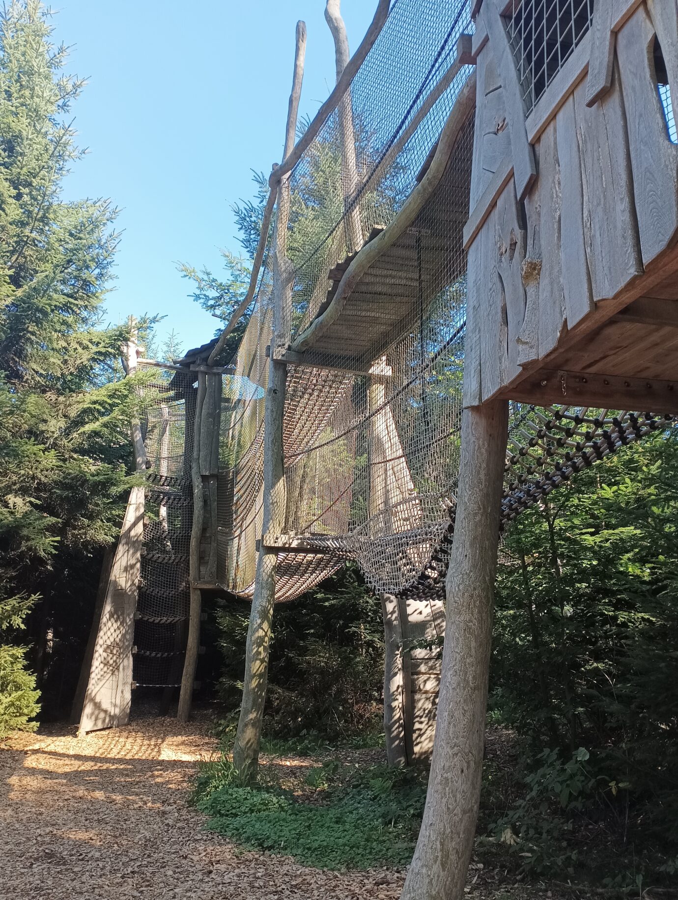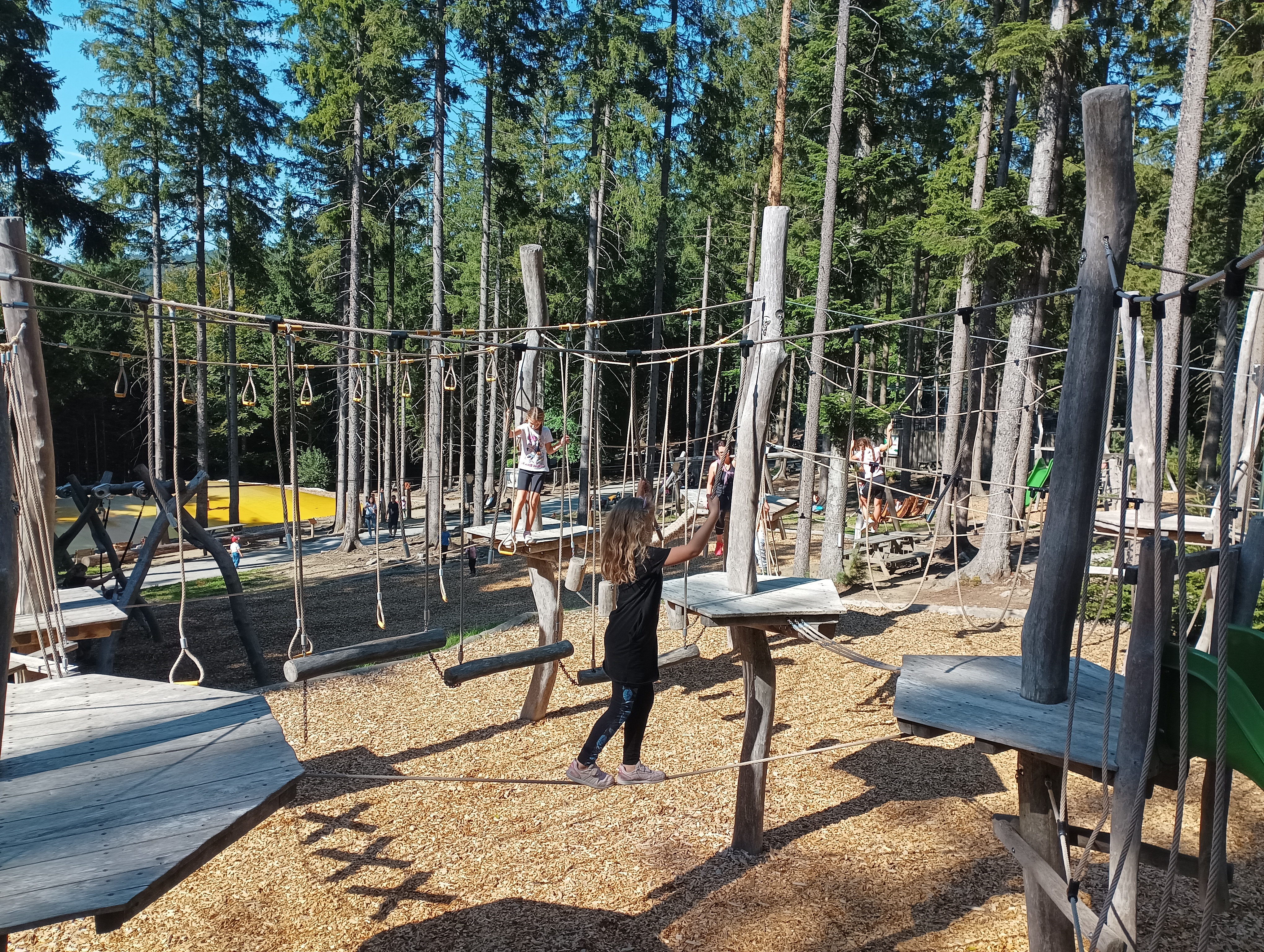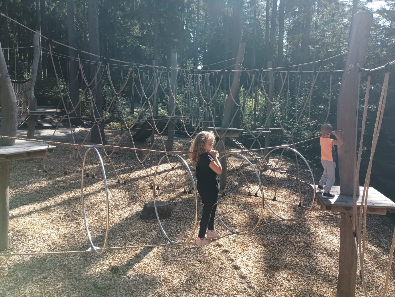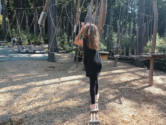 Větší děti i dospělí si pak mohou vyzkoušet síly a atletické dovednosti na Veverčí překážkové dráze nebo na Lesním hřišti pro velké atlety. My jsme si s dětmi vyzkoušely obojí a přiznávám, že na Lesním hřišti jsem měla i já občas problém dostat se do dalšího bodu. Doporučuji raději jistit děti na zemi, pod lanovými a dřevěnými prolézačkami. Naštěstí je pod nimi měkký písek, takže když spadnou, není to nic hrozného. Přesto je lepší děti při pádu zachytit.