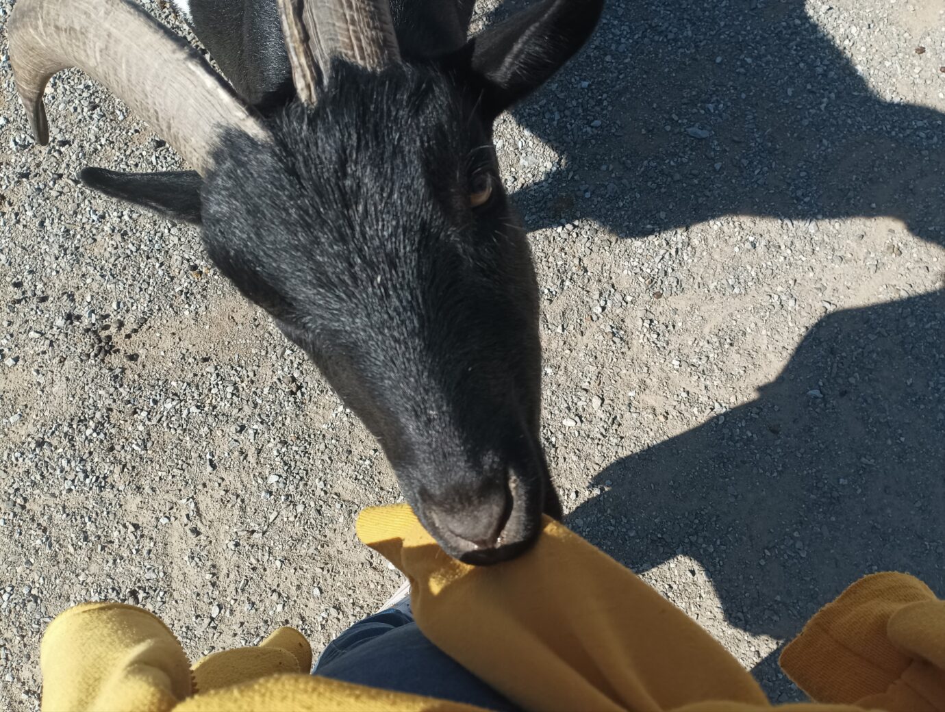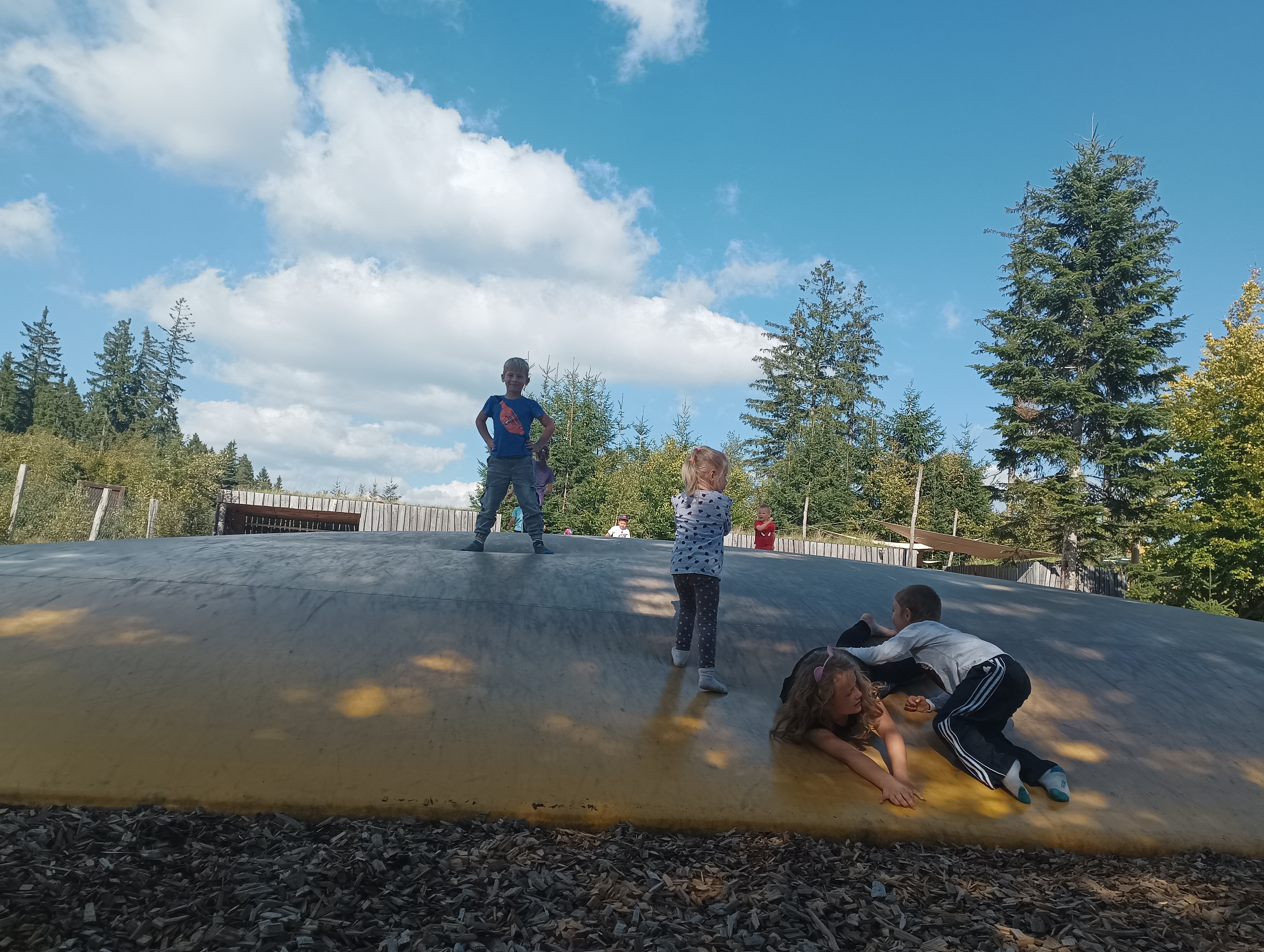 My jsme trampolínu vyzkoušeli také hned na začátek, ale pak nás zaujala ohrada s kozičkami. Ty jsou přítulné a milé. Můžete jim zakoupit granule a nakrmit je. Nechají se ale hladit i jen tak a budou na vás dorážet. Pozor na visící tkaničky od batohů a rukávy od mikiny, pokud ji máte uvázanou kolem pasu. My jsme odcházeli trochu ožvýkaní.