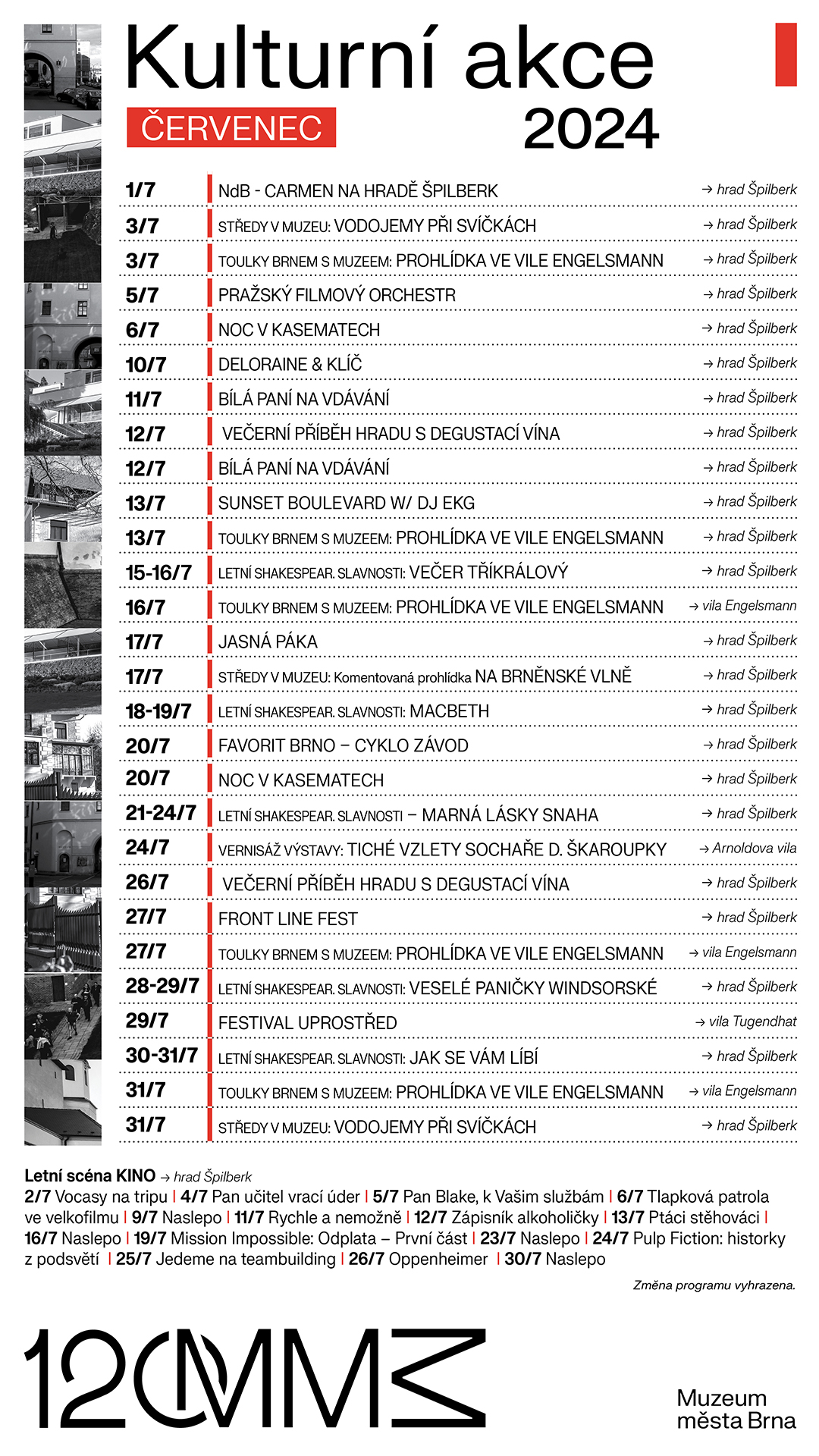 Muzeum města Brna připravilo na letní měsíce široké spektrum akcí. V červenci a srpnu se tak návštěvníci mohou těšit na netradiční prohlídky, kulturní akce, letní kina, divadla, festivaly a mnohem více ve všech objektech Muzea města Brna – na hradě Špilberku, ve vile Tugendhat, v Arnoldově vile, ale také mimo samotné muzeum.