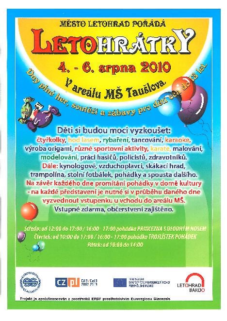 Tři dny plné her, soutěží a zábavy pro děti do cca 13 let. Děti si budou moci vyzkoušet například hod lasem, rybaření, tancování, různé sportovní aktivity, jízdu na čtyřkolce, karate, malování, modelování, práci hasičů, policistů a zdravotníků. V areálu bude k dispozici i skákací hrad. Na zakončení každého dne proběhne hraná pohádka (tímto opravujeme chybu vzniklou na plakátech, kde je chybně uvedeno promítání v DK).