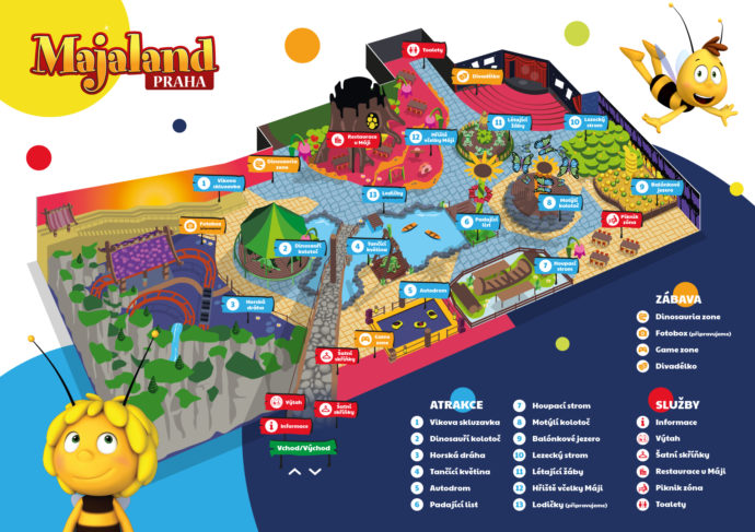 Užívat si můžete na 12 tematických atrakcích, v Majashop obchodu s hračkami, dobroty ochutnáte v restaurace u Máji!