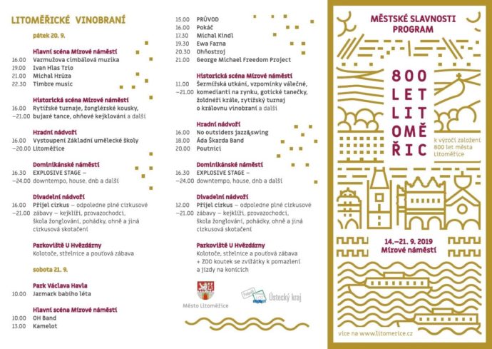 Program ve čtvrtek 19. 9. nabídne oblíbený Velký letní koncert litoměřického festivalového sboru s Teplickou filharmonií od 19 hodin. Vzhledem k odpolední zkoušce početného tělesa nebylo možné na odpoledne plánovat další program.