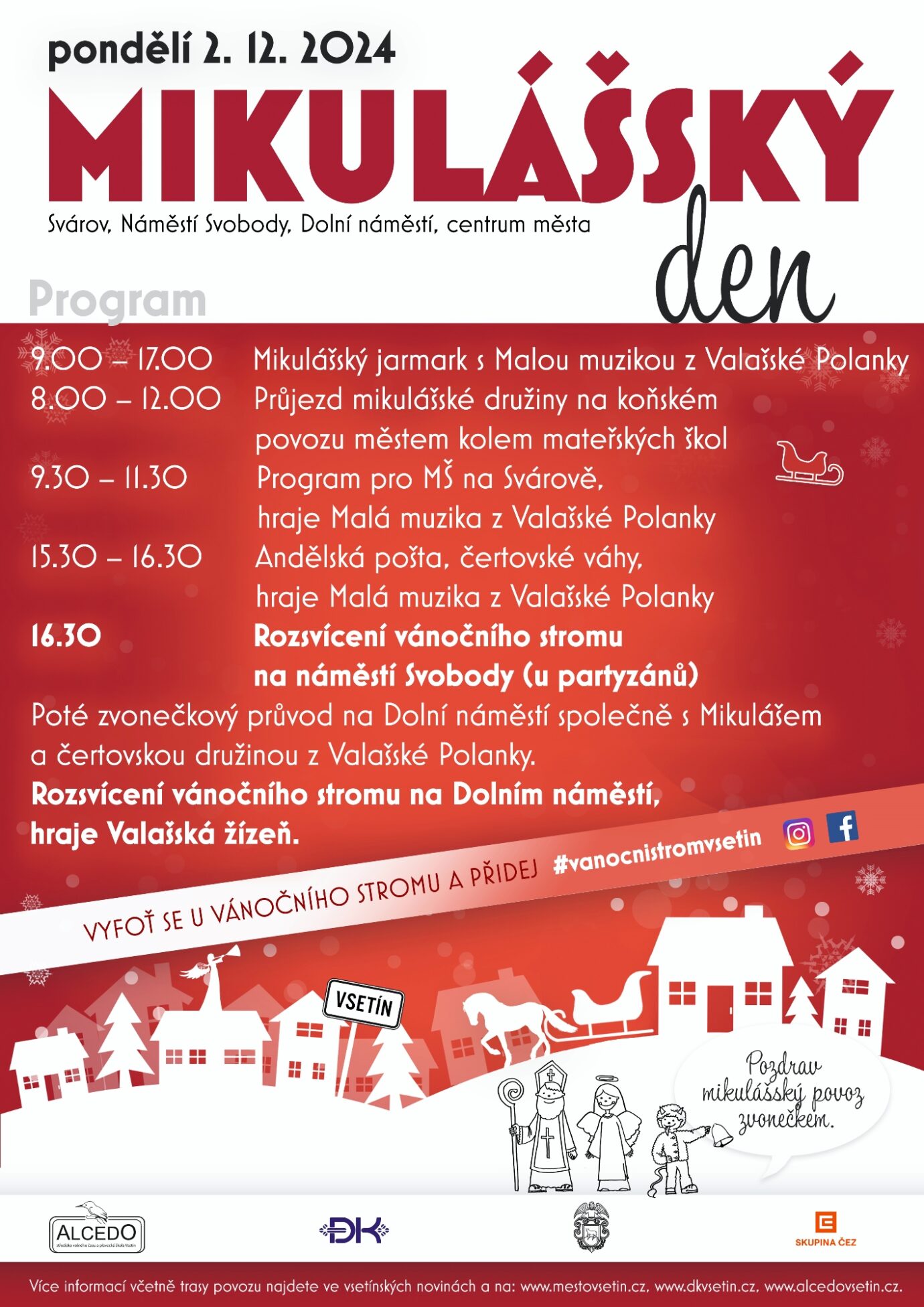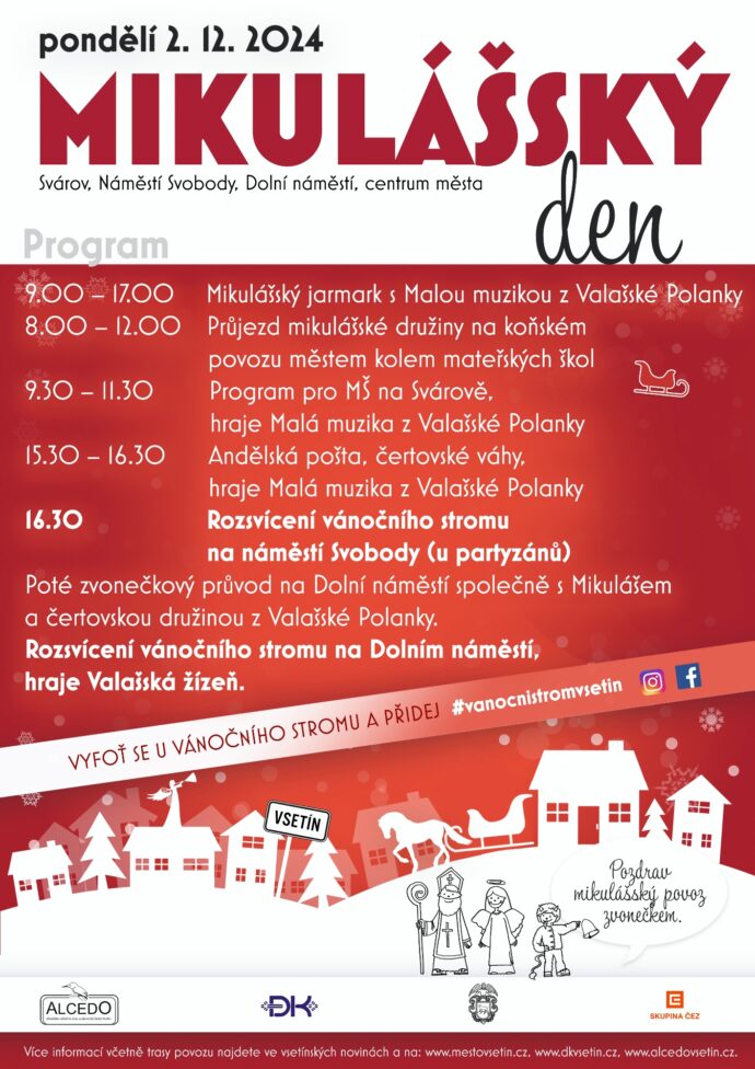 Blížící se adventní čas zpestří v centru Vsetína tradiční Mikulášský den, který proběhne v pondělí 2. prosince. Mikuláš se svou družinou se dopoledne vydá na koňském povoze navštívit děti v mateřských školách, odpoledne pak zavítá do centra města, kde bude na všechny čekat oblíbený Mikulášský jarmark. Ani letos nebude chybět tradiční zvonečkový průvod, který spolu s Mikulášem a čertovskými družinami rozsvítí vánoční stromy na vsetínských náměstích. Akci pořádá Dům kultury Vsetín, Alcedo – středisko volného času a Město Vsetín s finanční podporou společnosti ČEZ.