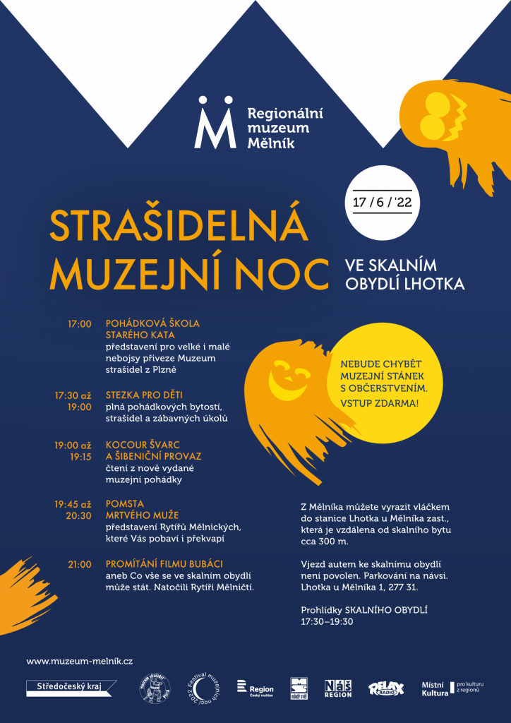 Těšte se na představení pro velké i malé nebojsy, stezku pro děti plnou pohádkových bytostí, strašidel a zábavných úkolů, čtení z nově vydané muzejní pohádky, představení Rytířů Mělnických, které Vás pobaví i překvapí, promítání filmu Bubáci aneb Co vše se ve skalním obydlí může stát? Uvidíte!