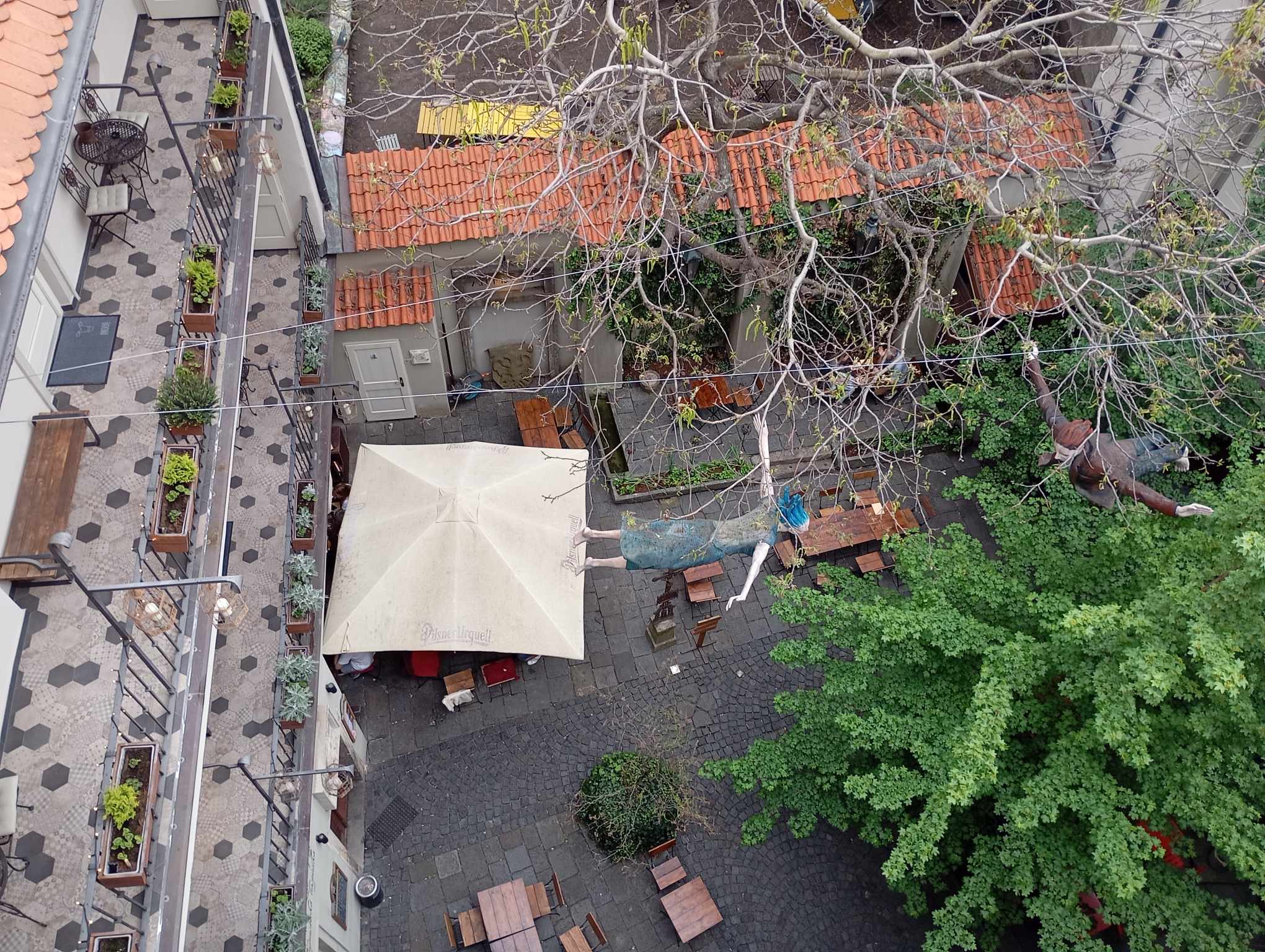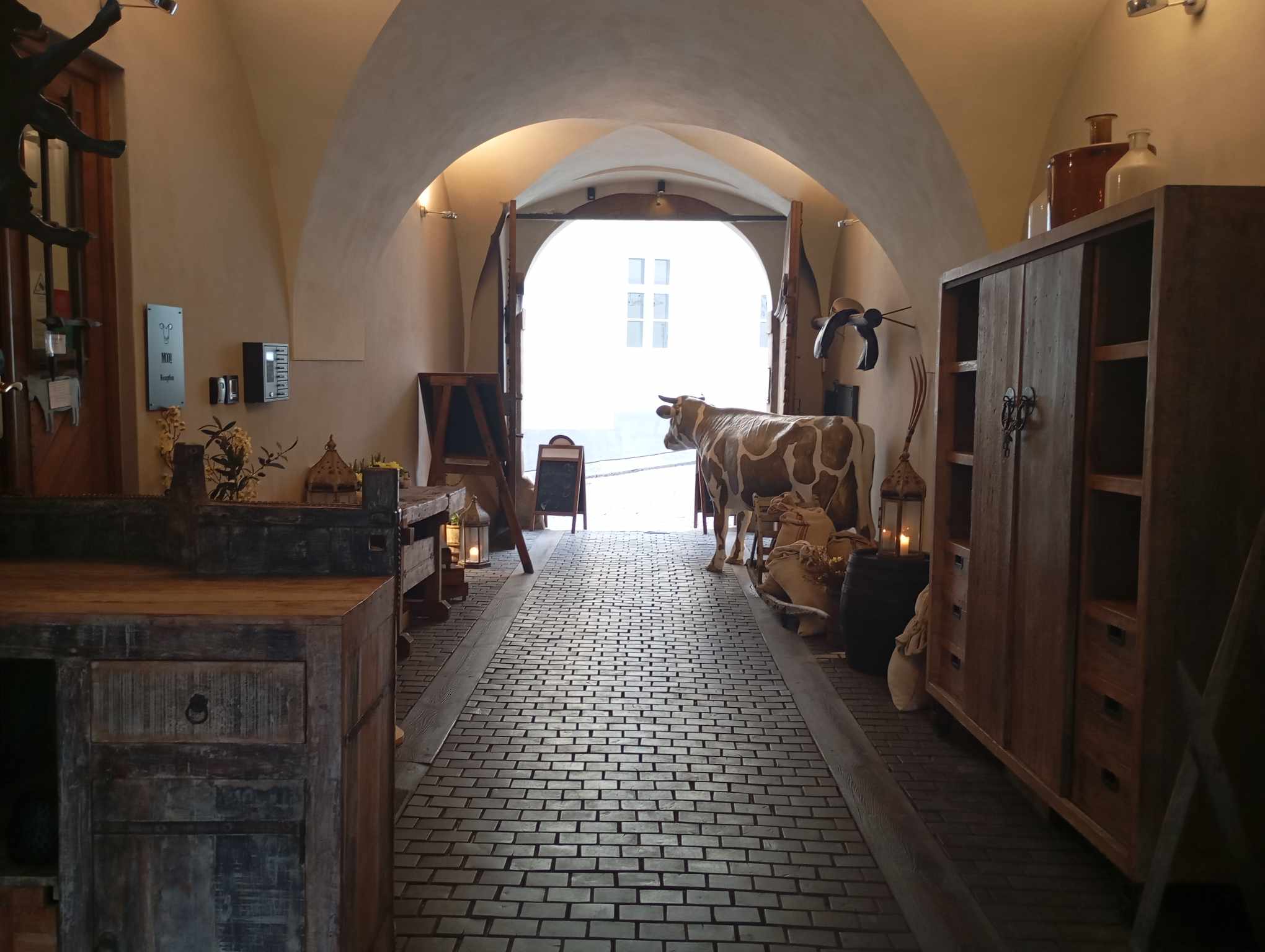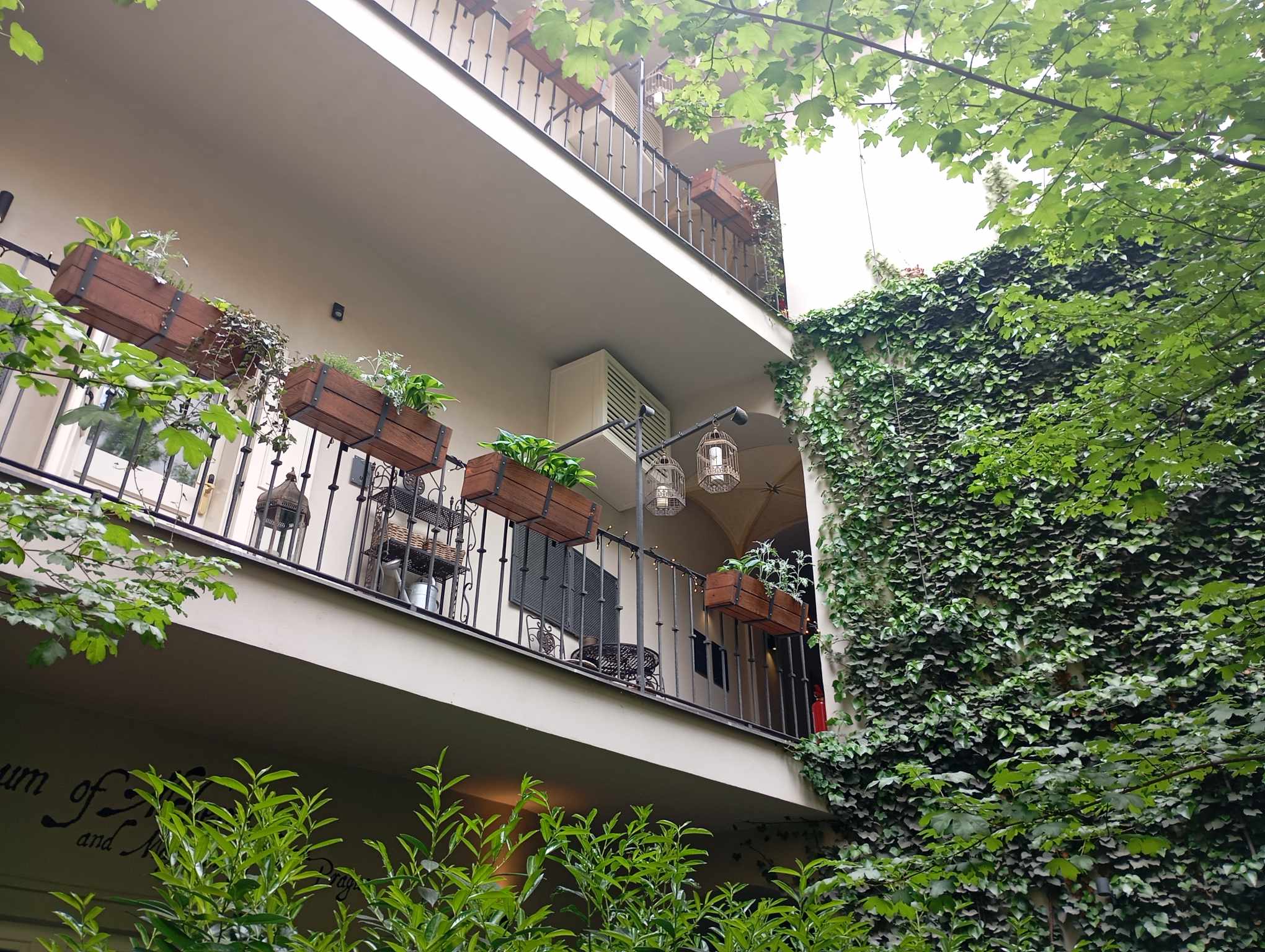 Muzeum alchymistů a mágů staré Prahy najdete na Malé Straně, na adrese Jánský vršek 8. Už samotný průchod na dvorek vás nadchne vintage výzdobou i barevnou krávou, která přitahuje pozornost hlavně malých dětí. Posezení na dvorku je příjemné, díky kulisám starobylého domu, pavlačím, zeleni a lucernám. Když zvednete hlavy, zjistíte, že se nad vámi vznáší dvě postavy. My jsme si jich ale všimli až při pohledu z druhé strany – z věže, na kterou můžete vystoupat v rámci prohlídky muzea.