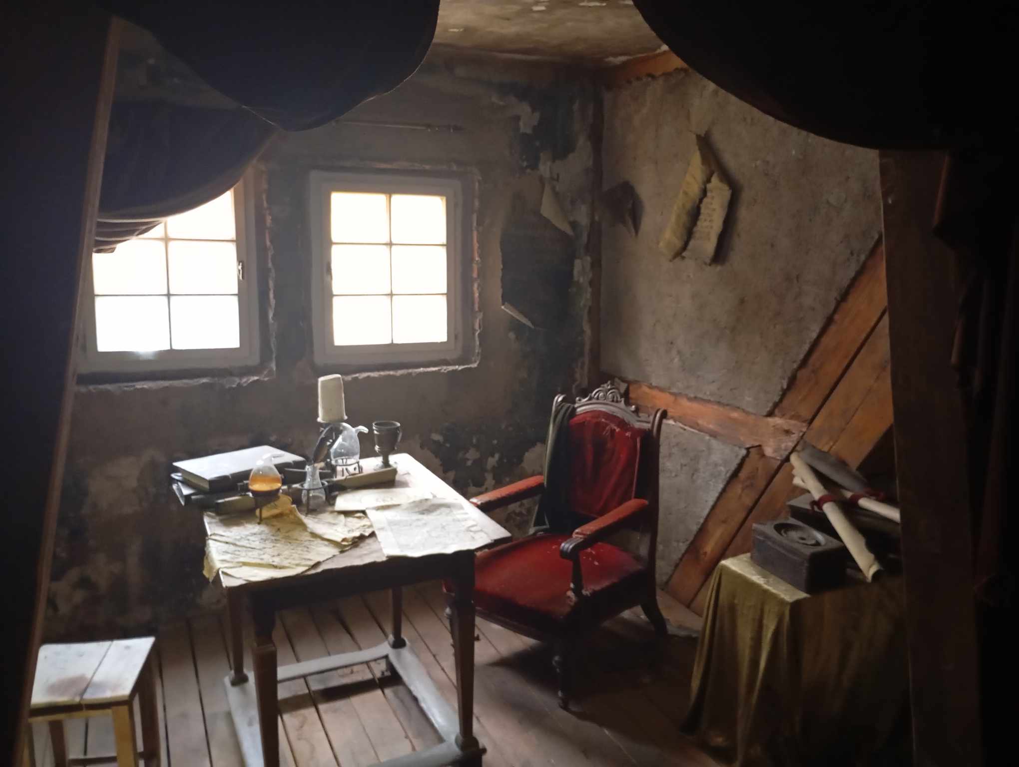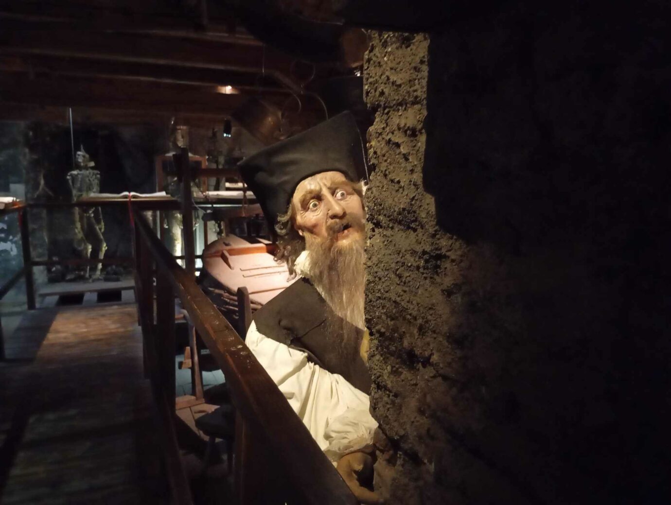 Až si vše u pokladny prohlédnete, čeká na vás komentovaná prohlídka samotného domu, v němž přebýval Edward Kelley ale třeba i William Shakespeare. Uvidíte, jak to v domě vypadalo, poznáte část knihovny Edvarda Kelleyho, uvidíte baňky a další pomůcky alchymistů a mnoho dalšího. V muzeu poznáte, jak Edward Kelley vytvářel kámen mudrců, nebo jak vznikal takový homunkulus. Nechybí laboratoř po výbuchu zamrzlá v čase, opička v kleci, na které se dělaly pokusy, ani sám mistr Kelley s dřevěnou nohou a uříznutýma ušima. Schovává se vtipně za komínem, protože právě trochu neodhadl pokus a jeho laboratoř vylétla do vzduchu.