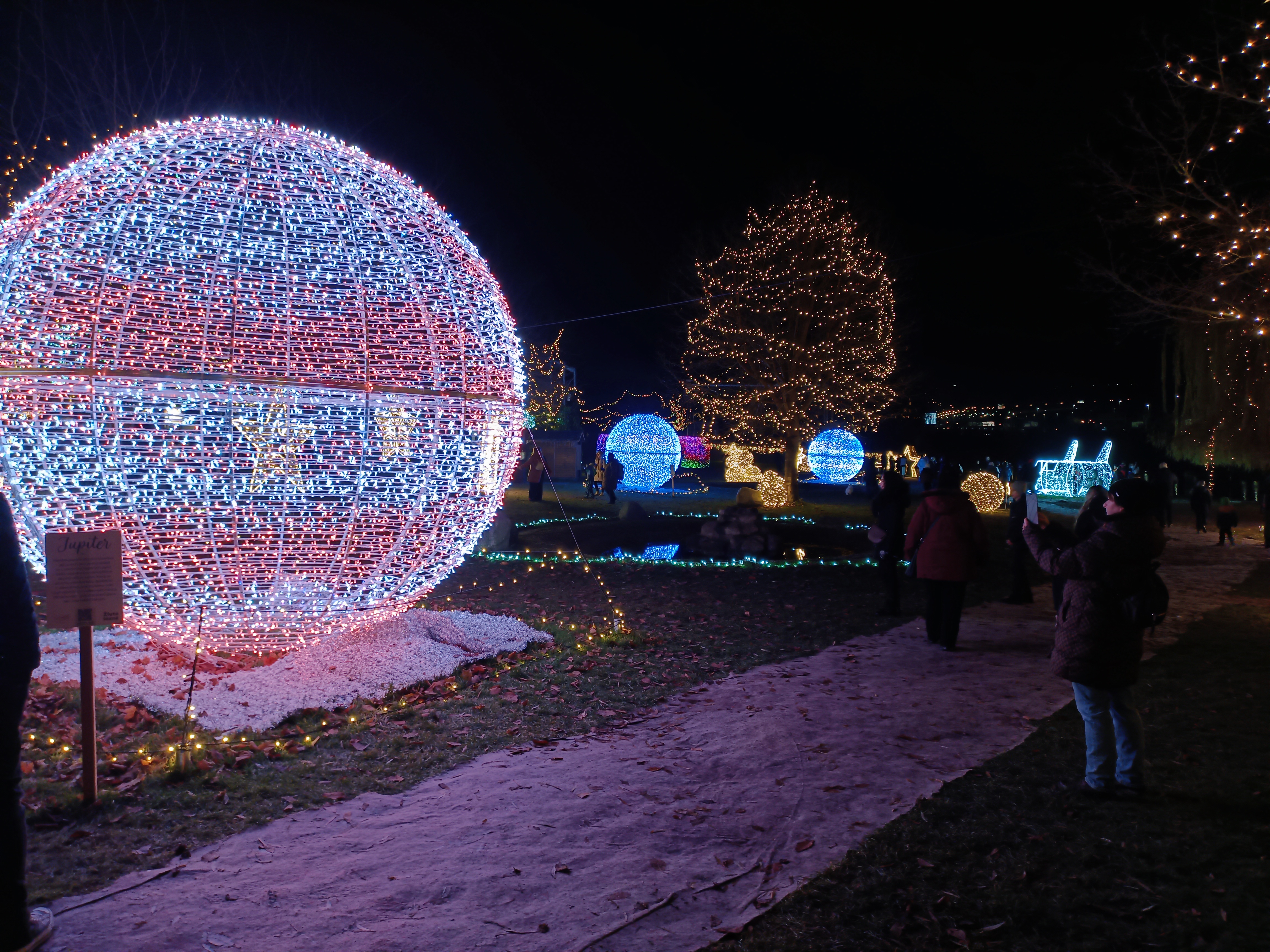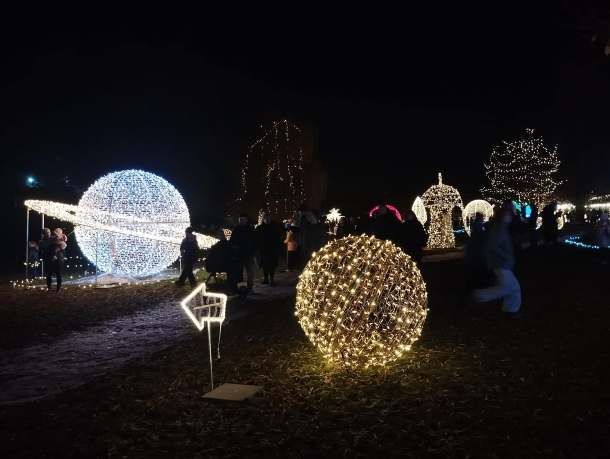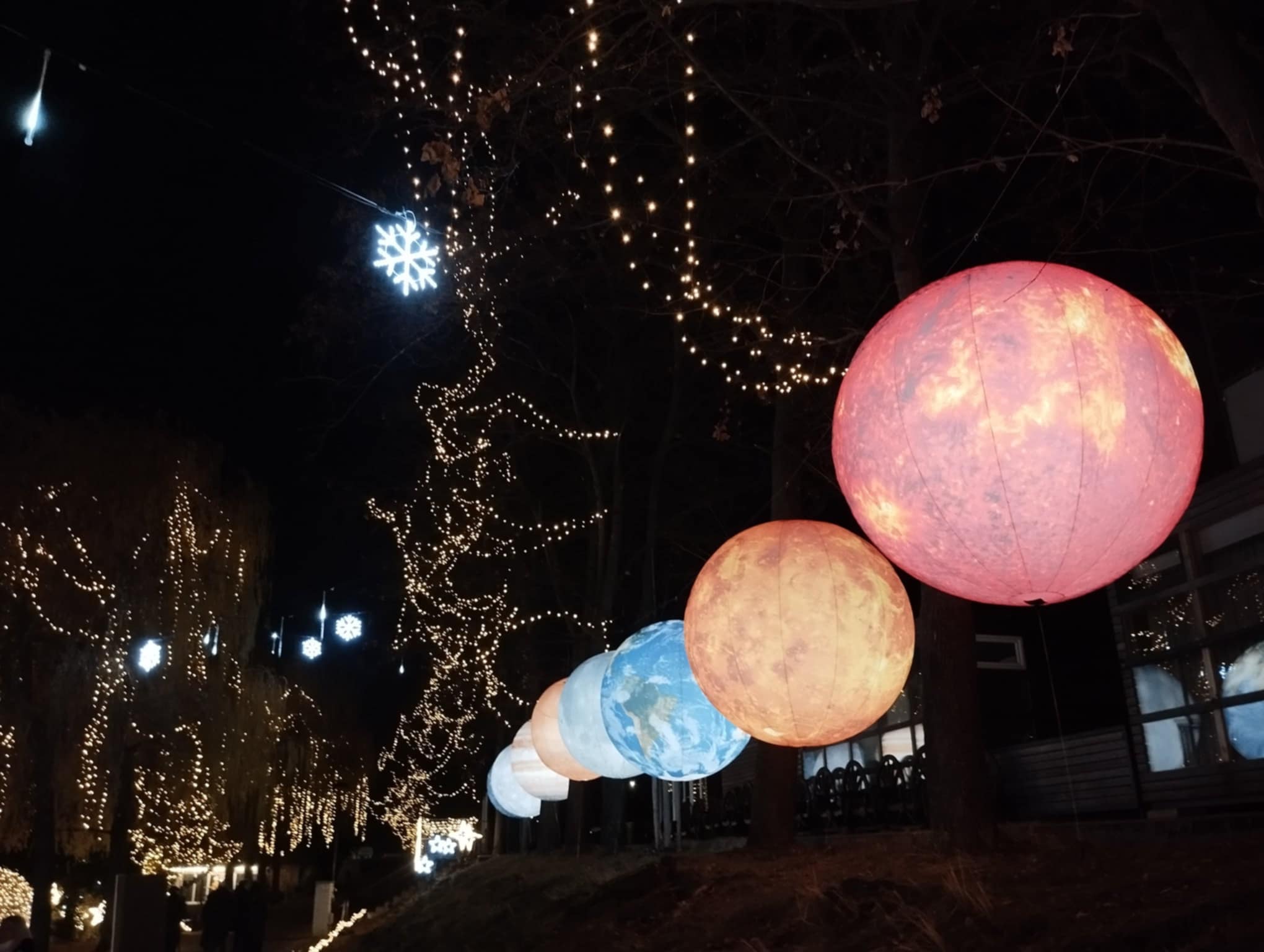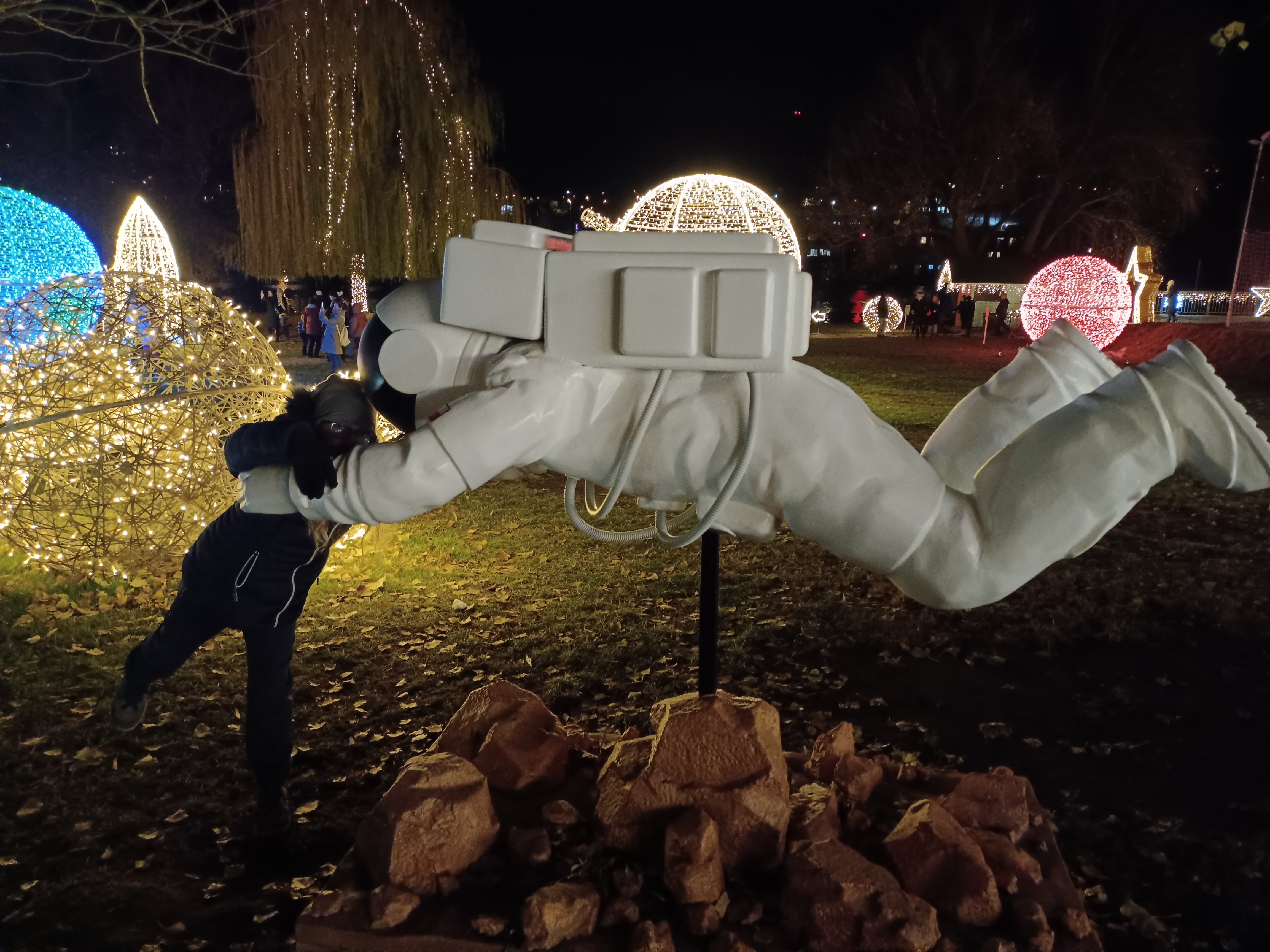 Žluté lázně velmi dobře známe, bylo tedy zajímavé je vidět v „jiném světle“. Park byl přeměněný na zářící svět plný barevných světelných instalací, které znázorňovaly hvězdnou galaxii, sluneční soustavu, planety i samotné raketoplány a kosmonauty. Děti byly nadšené a běžely od jednoho světelného objektu ke druhému a ochotně pózovaly na fotky. Atmosféru dotvářela příjemná hudba, která nás vtáhla do kosmického dobrodružství. Po parku jsme se pohybovali po vyznačených chodníčcích, pohodlně se tu dá jezdit také s kočárkem.