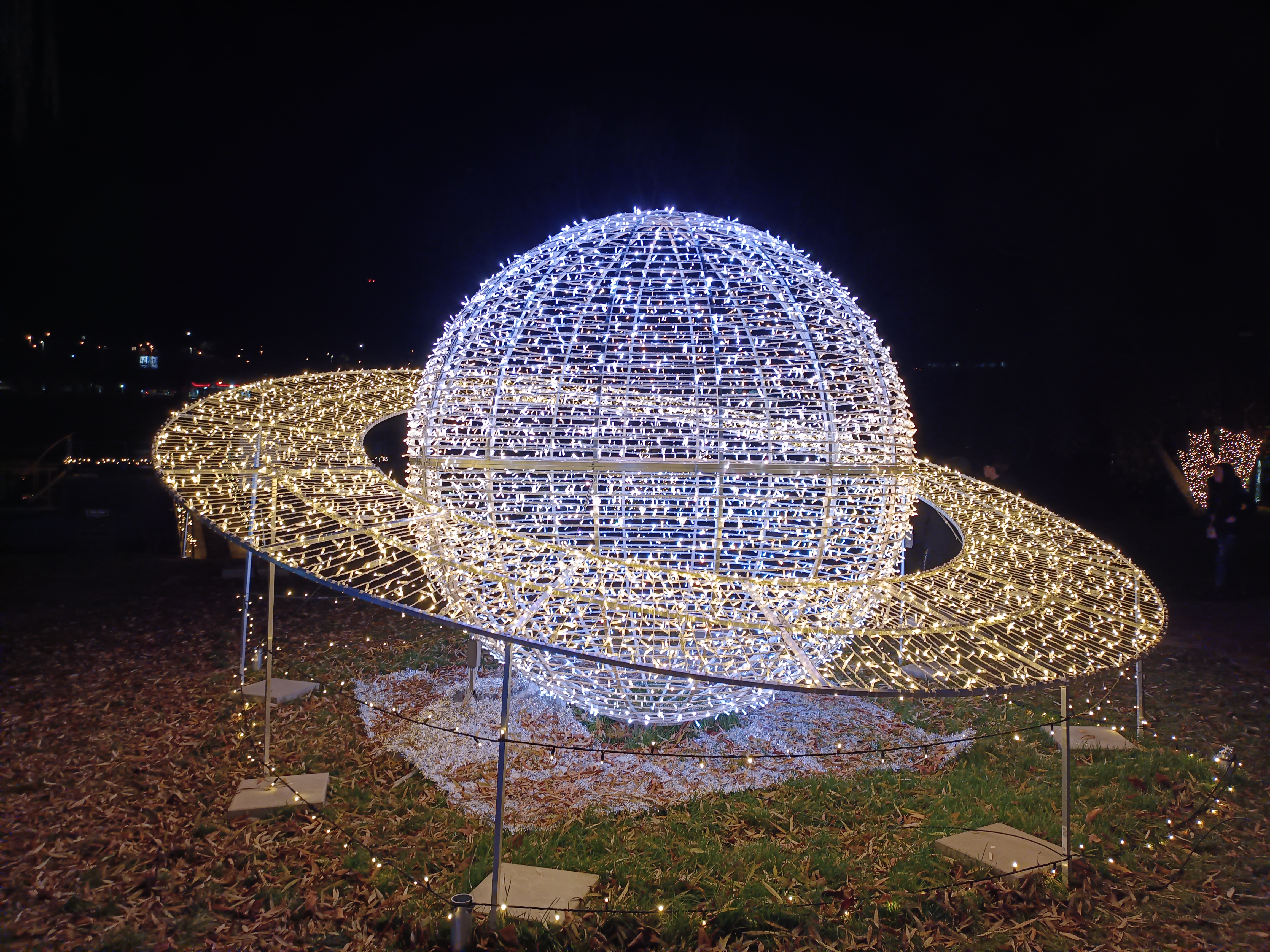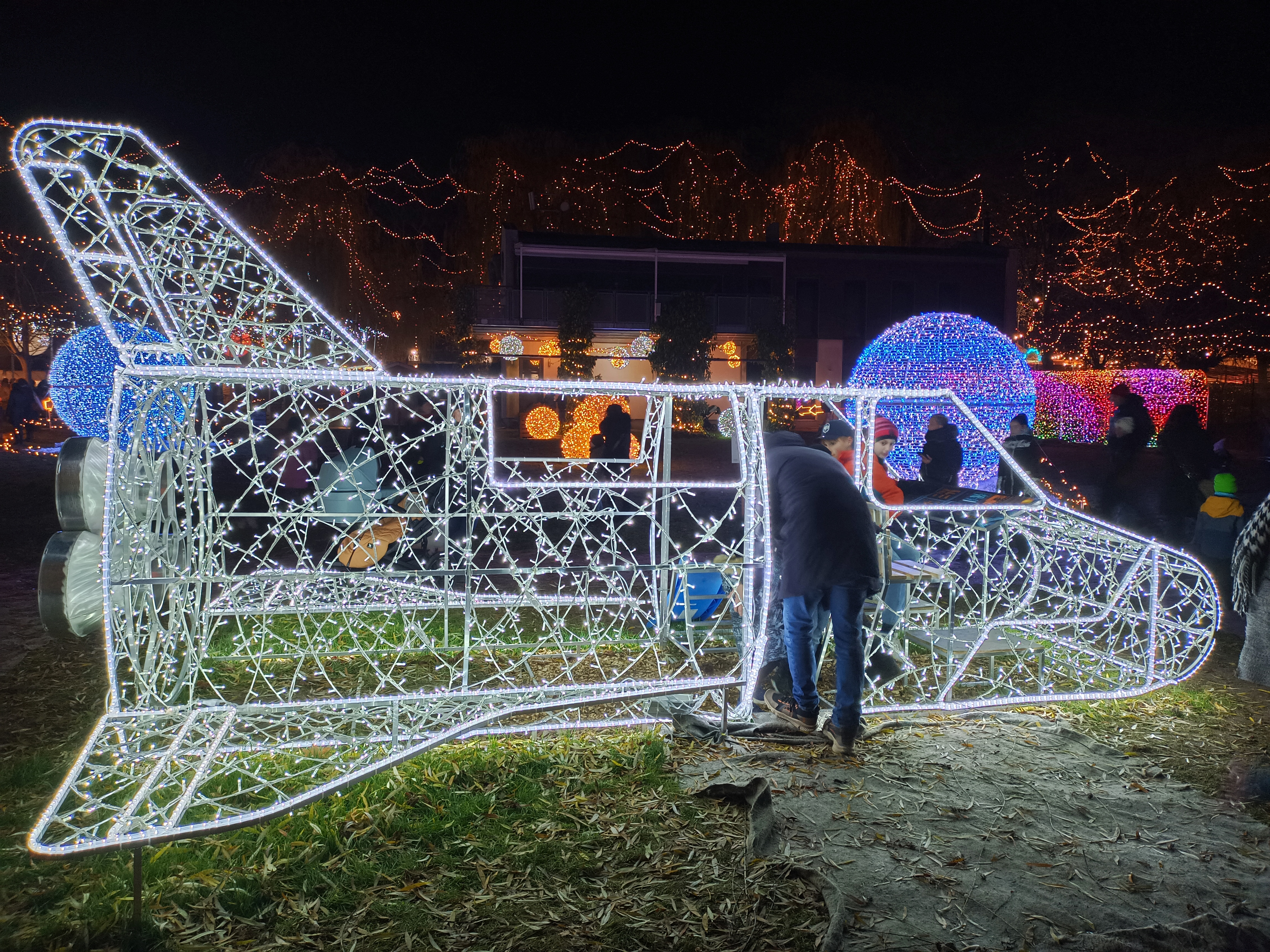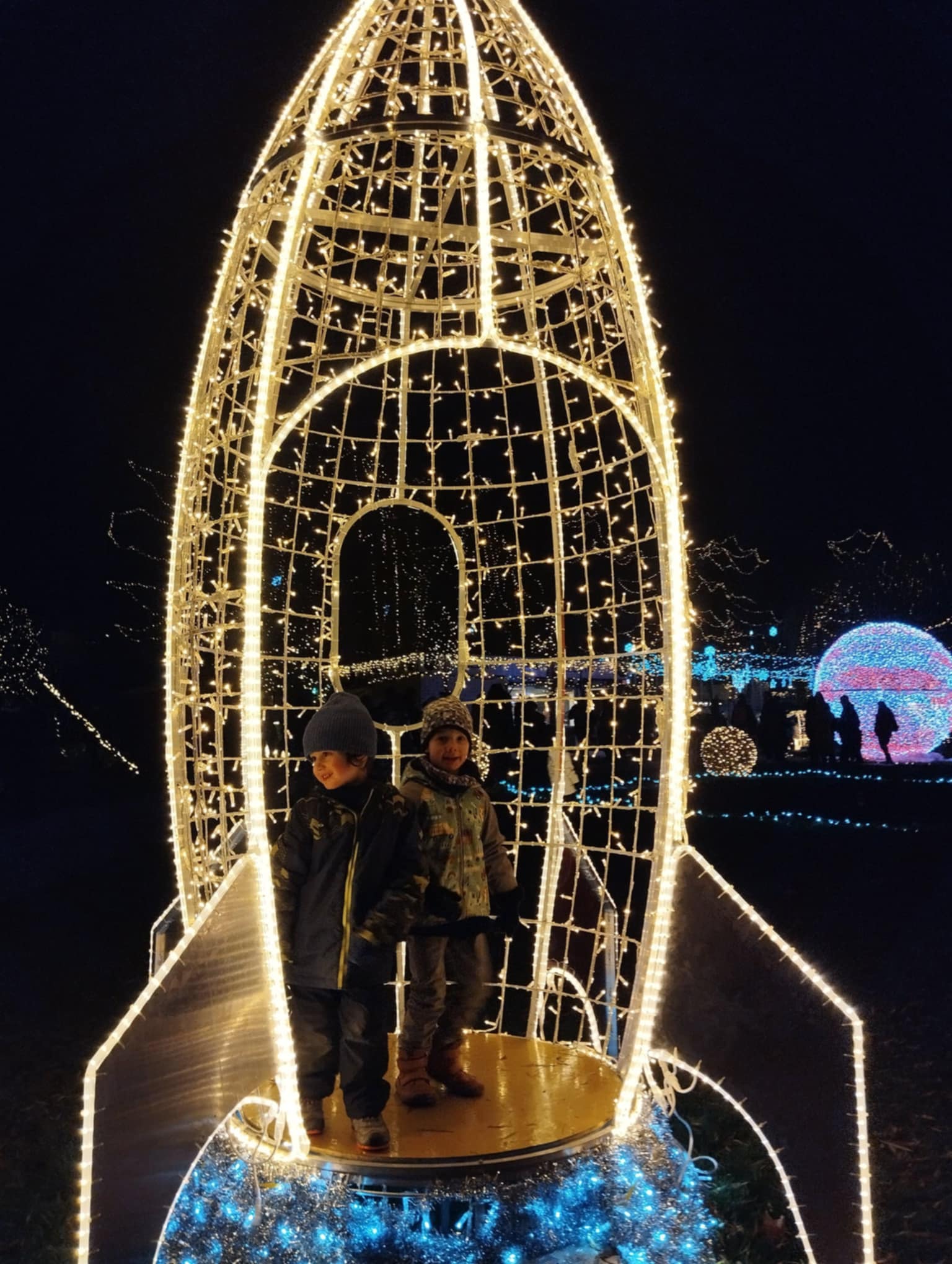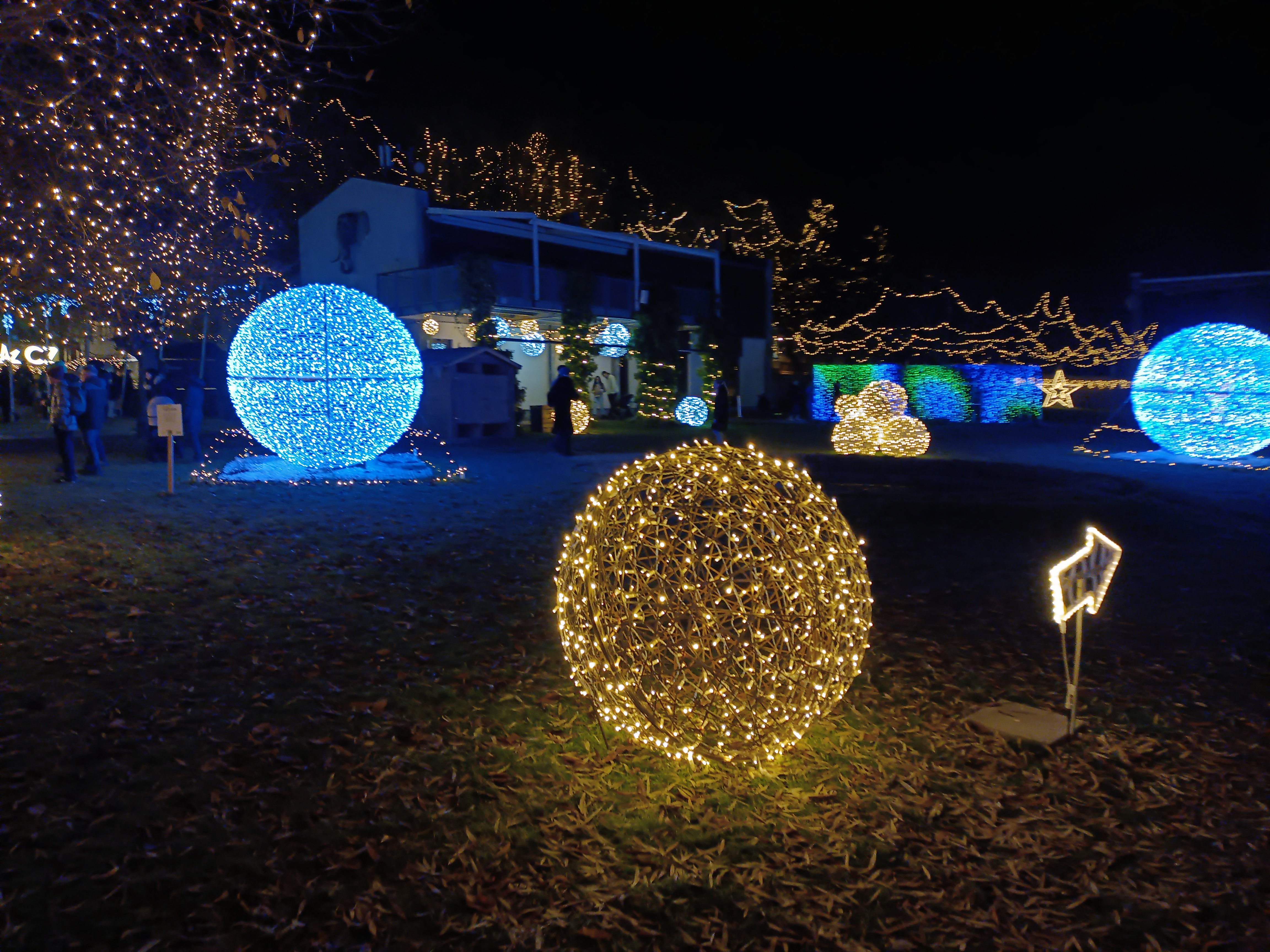 Žluté lázně velmi dobře známe, bylo tedy zajímavé je vidět v „jiném světle“. Park byl přeměněný na zářící svět plný barevných světelných instalací, které znázorňovaly hvězdnou galaxii, sluneční soustavu, planety i samotné raketoplány a kosmonauty. Děti byly nadšené a běžely od jednoho světelného objektu ke druhému a ochotně pózovaly na fotky. Atmosféru dotvářela příjemná hudba, která nás vtáhla do kosmického dobrodružství. Po parku jsme se pohybovali po vyznačených chodníčcích, pohodlně se tu dá jezdit také s kočárkem.