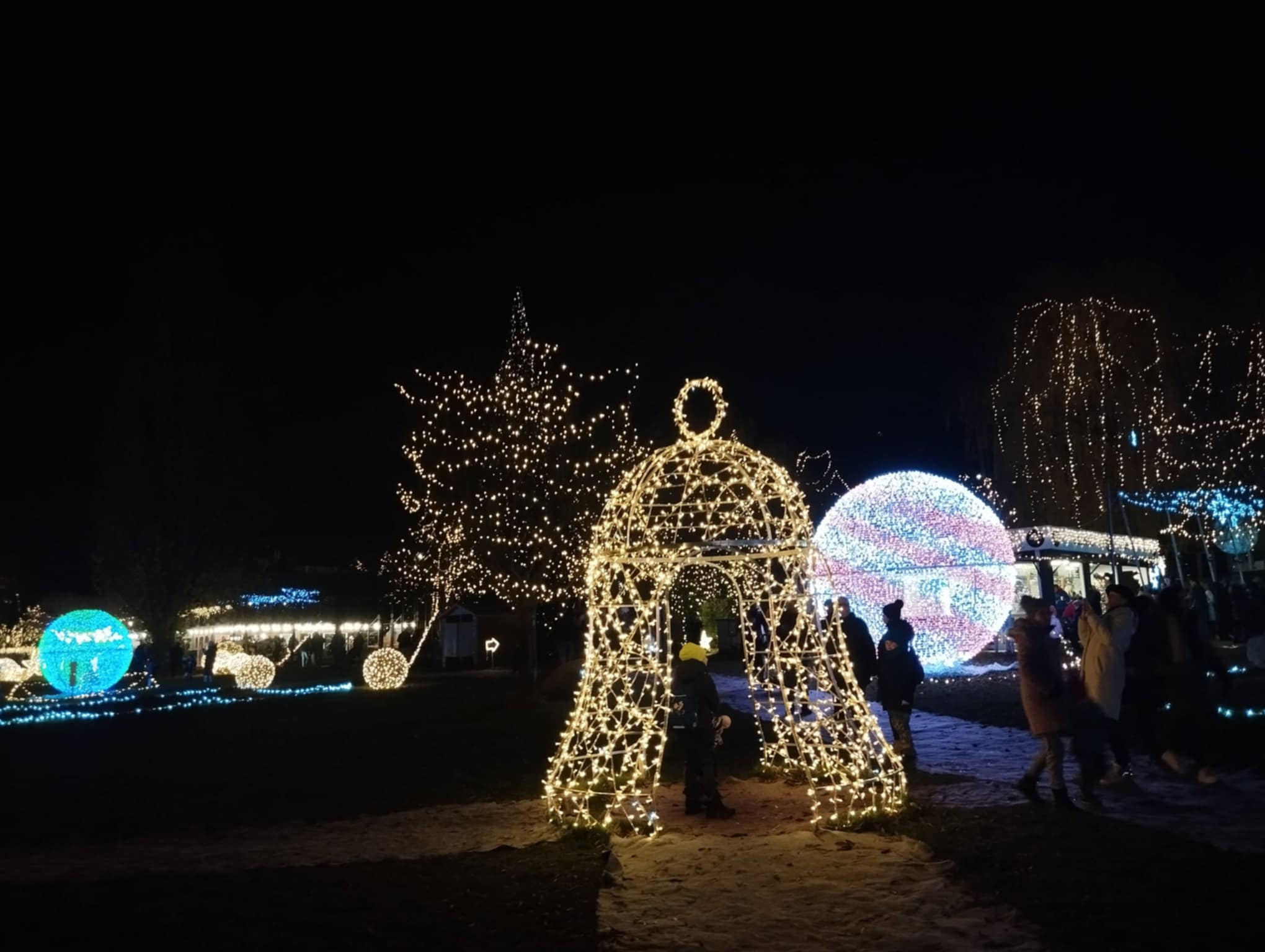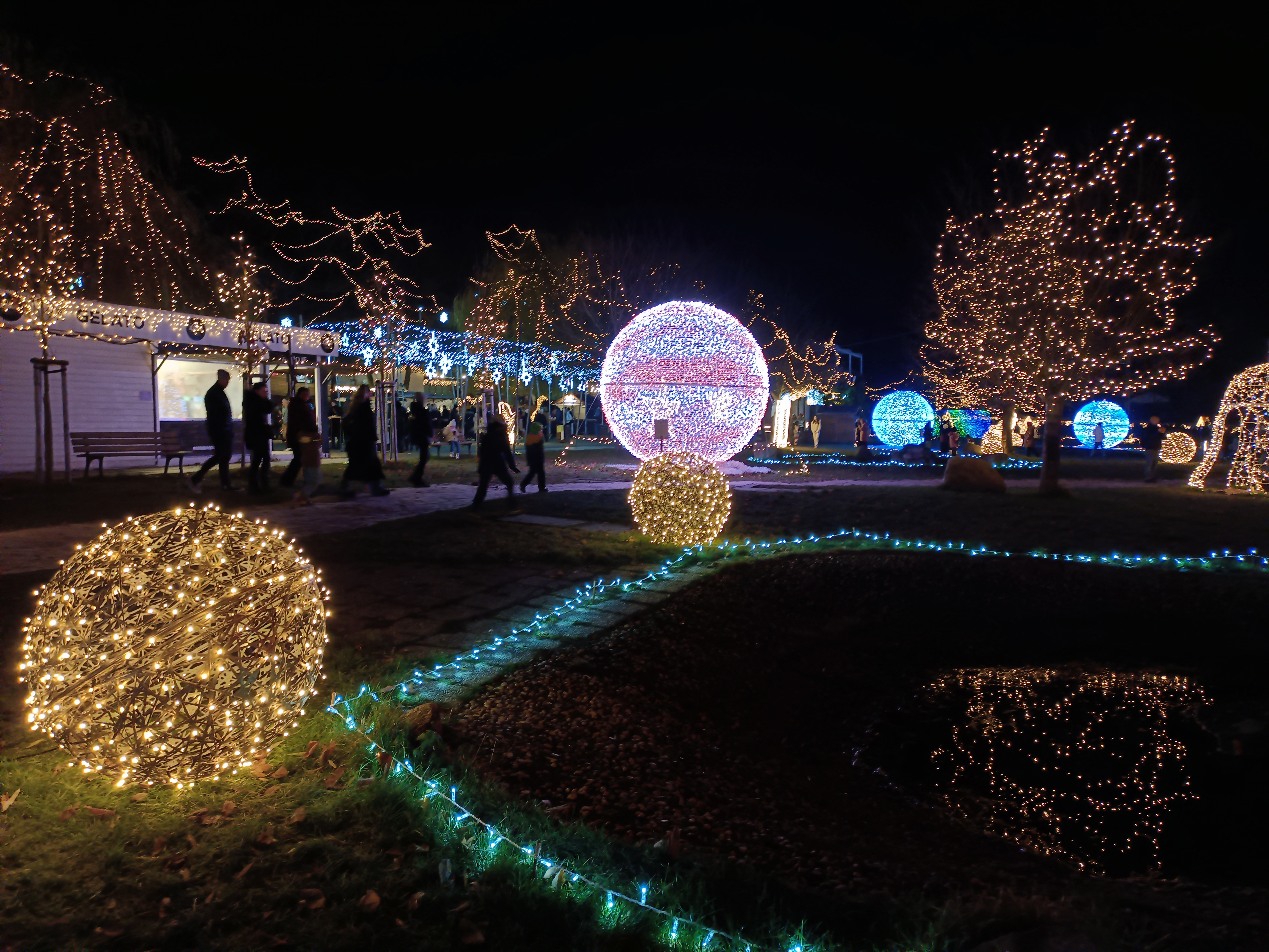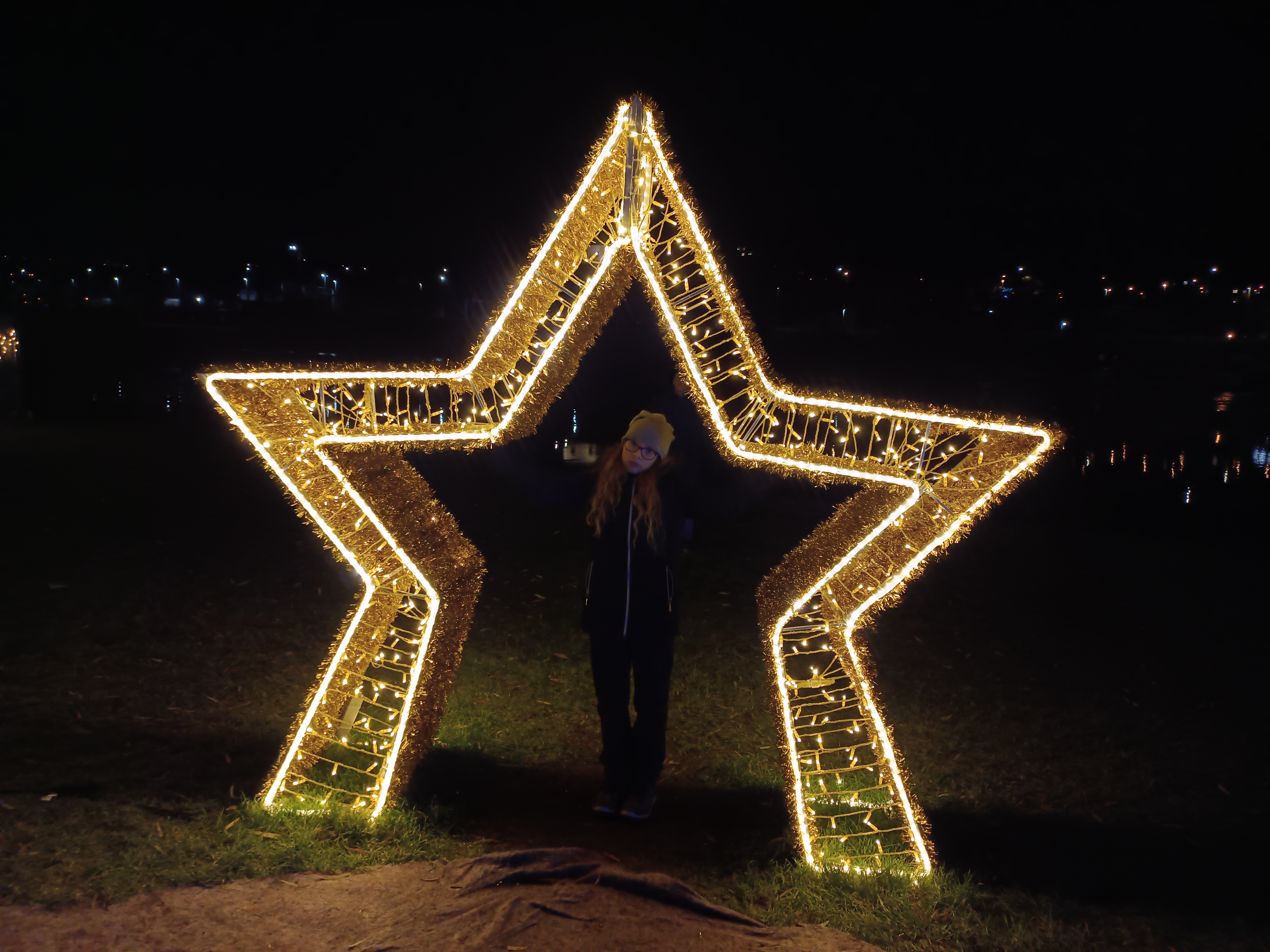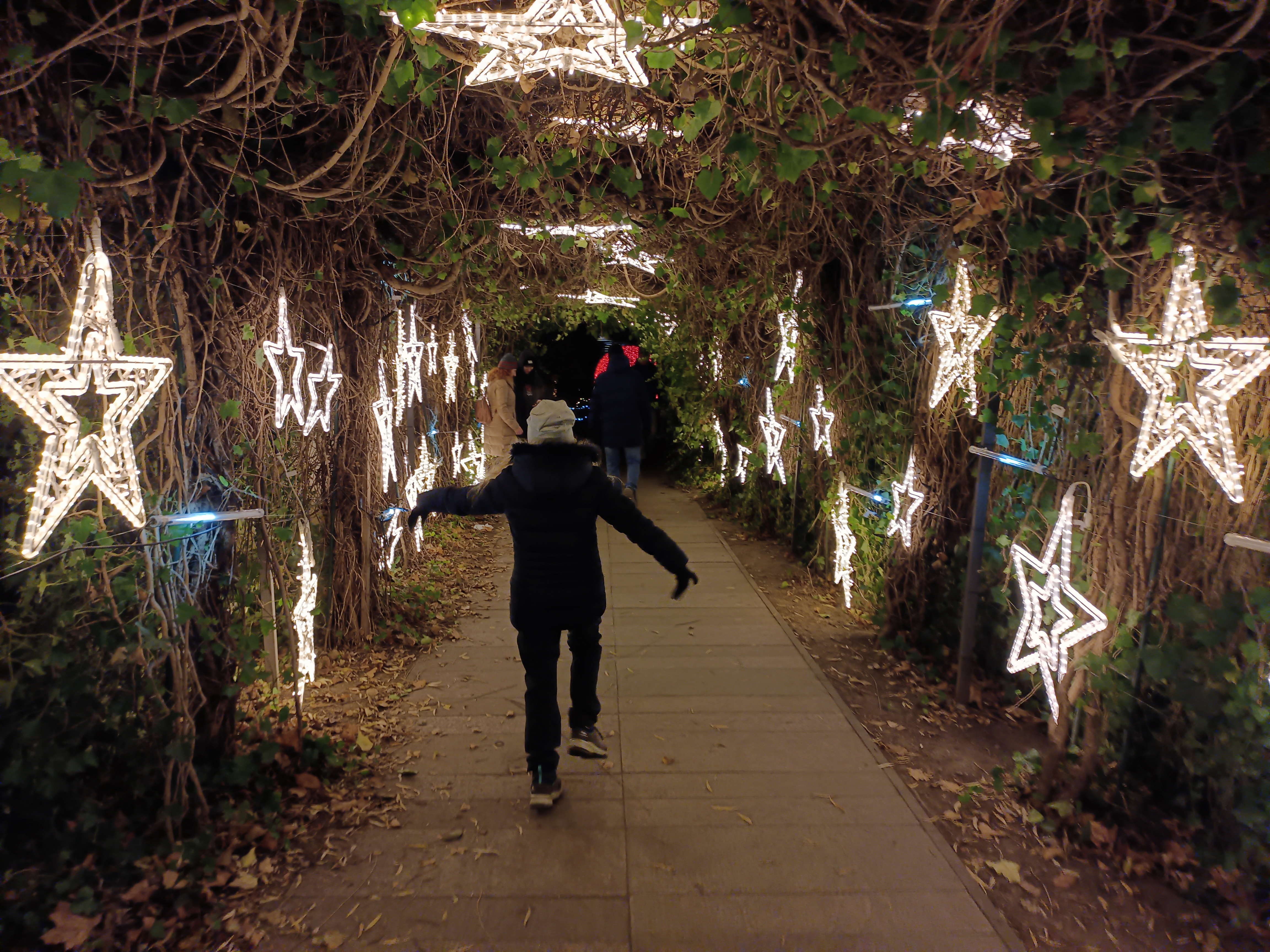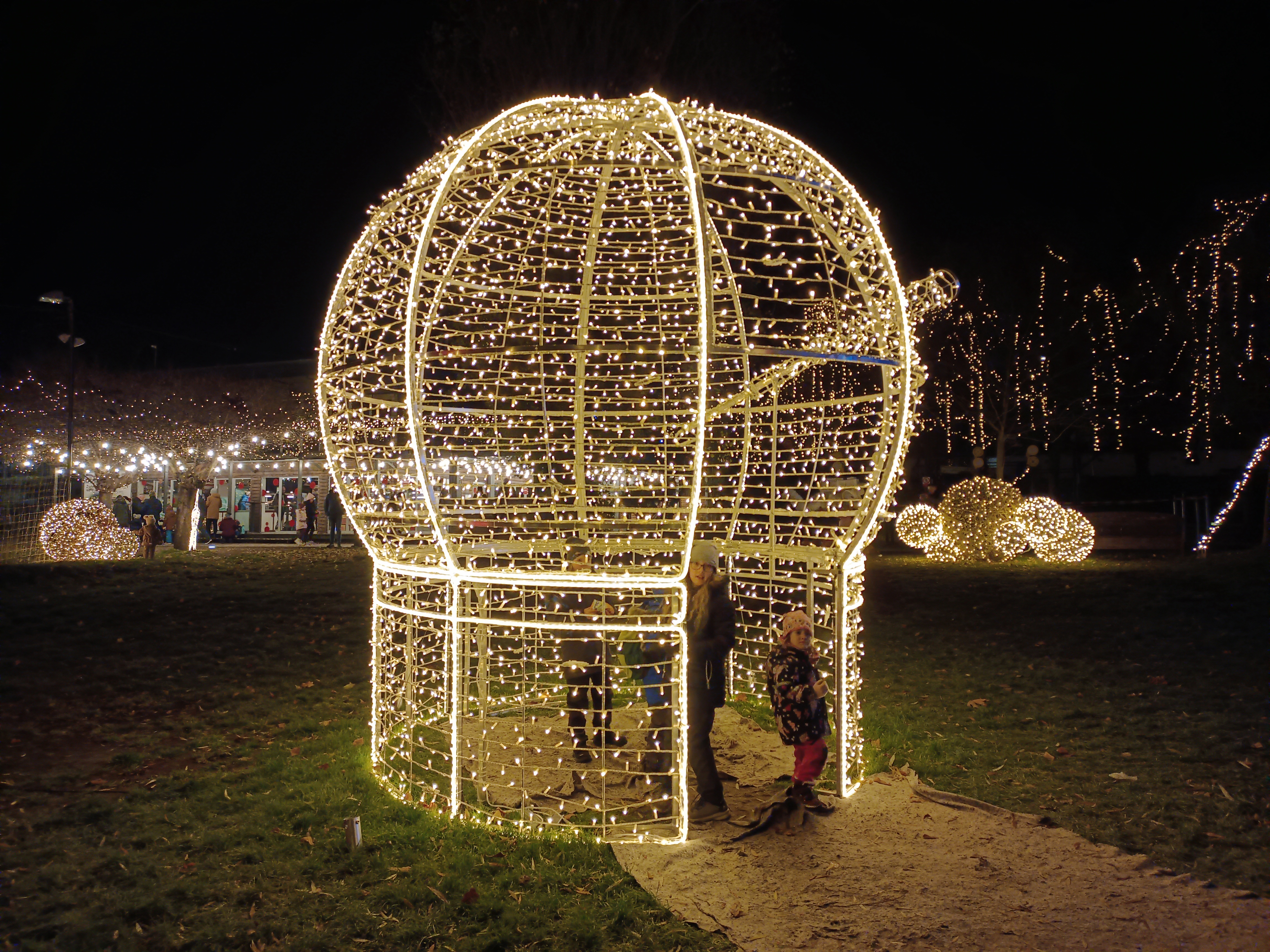Žluté lázně velmi dobře známe, bylo tedy zajímavé je vidět v „jiném světle“. Park byl přeměněný na zářící svět plný barevných světelných instalací, které znázorňovaly hvězdnou galaxii, sluneční soustavu, planety i samotné raketoplány a kosmonauty. Děti byly nadšené a běžely od jednoho světelného objektu ke druhému a ochotně pózovaly na fotky. Atmosféru dotvářela příjemná hudba, která nás vtáhla do kosmického dobrodružství. Po parku jsme se pohybovali po vyznačených chodníčcích, pohodlně se tu dá jezdit také s kočárkem.