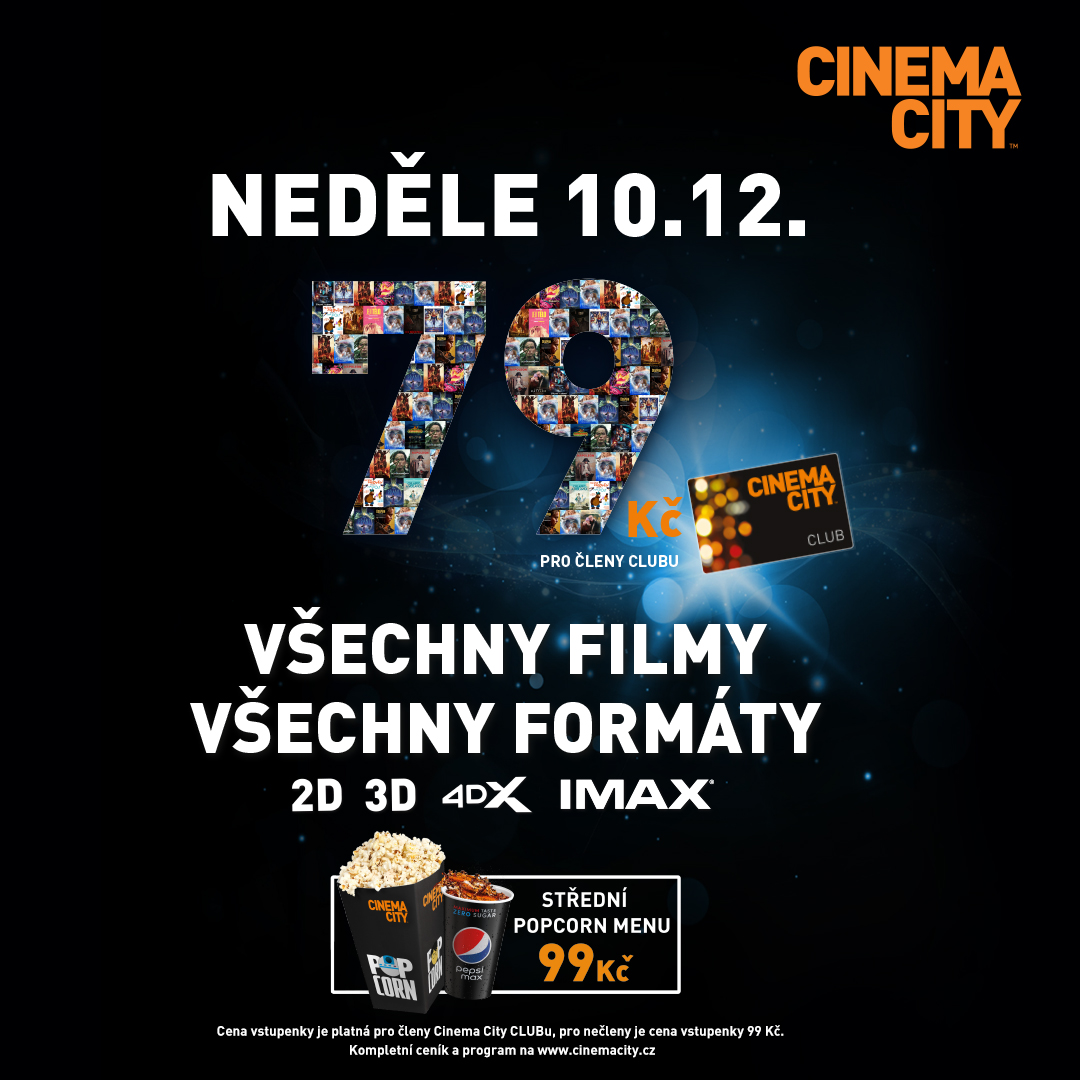 V neděli 10. prosince multiplexy Cinema City opět spouští oblíbenou akci s názvem LEVNÁ NEDĚLE, během které si diváci užijí spoustu filmů za zlomek ceny. Na programu lze vybírat téměř z 20 filmů, českých i zahraničních, a několika filmových formátů pro ještě lepší zážitek. Na výběr je jak z klasických 2D a 3D formátů, tak speciálních formátů, mezi které patří IMAX a 4DX.