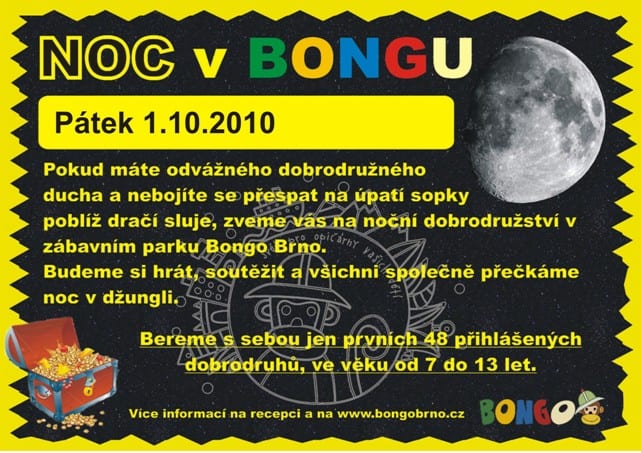 Jste odvážní, zvídaví a rádi soutěžíte? Jezdíte rádi do Bonga? Láká Vás, jak vypadá Bongo v noci? Pokud ano, tak neváhejte a přihlaste se na naše noční dobrodružství . Vypravíme se po stopách pirátského pokladu a jistě při tom zažijeme spoustu dobrodružství a zábavy! Sraz všech dobrodruhů je v pátek 1.10.2010 v 17:30 hodin v hale Bongo na recepci. Pokud přežijete nástrahy džungle, vyzvednou si vás rodiče v sobotu 2. 10. 2010 v 9:30 hodin. Bereme s sebou jen prvních 50 přihlášených dobrodruhů ve věku od 7 do 13 let. Další informace včetně přihlášky k vyzvednutí na recepci nebo Vám je na požádání zašleme e-mailem.