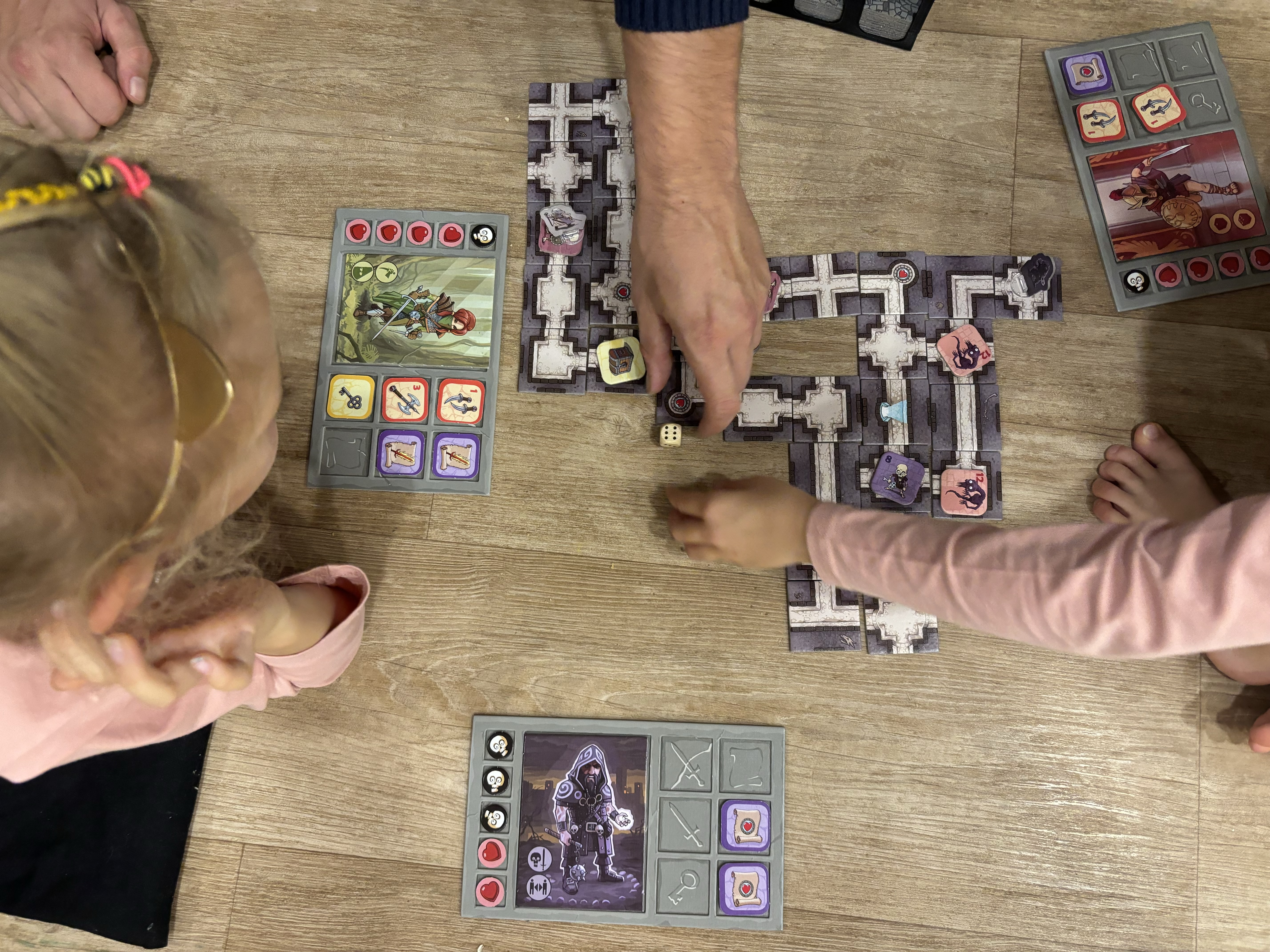 Karak je hra pro zkušenější hráče. Ani ne tak pro svá pravidla, ale pro délku hry. Průměrně jednu hru hrajeme 40 minut, a to vyžaduje už dětskou trpělivost. Sami s tím u šestiletých bojujeme, ale hra je tak baví, že většinou jednu hru zvládnou. A o co ve hře jde? Každý z hráčů si na začátku vylosuje jednu kouzelnou bytost, která má schopnosti, které hráči dávají výhodu ve hře. Pak se skládají kartičky – zdi hradu Karak. Po vylosování máte cestu nebo místnost, pokud místnost, tak losujete žeton z pytlíčku. Většinou je to nějaké strašidlo, které musíte přemoci hodem kostkami. Když se vám to povede, získáváte odměnu, která je na druhé straně žetonu. Buď je to klíč k truhle, kouzlo nebo zbraně. Zbraně pak mají různou hodnotu a díky nim se vám v každém kole přičítá tolik bodů, kolik máte na zbraních. Vyhrává ten, kdo po vylosování a přemožení žetonu s drakem má nejvíce truhliček. Je to takové dračí doupě pro nejmenší, které baví jak holky, tak kluky.