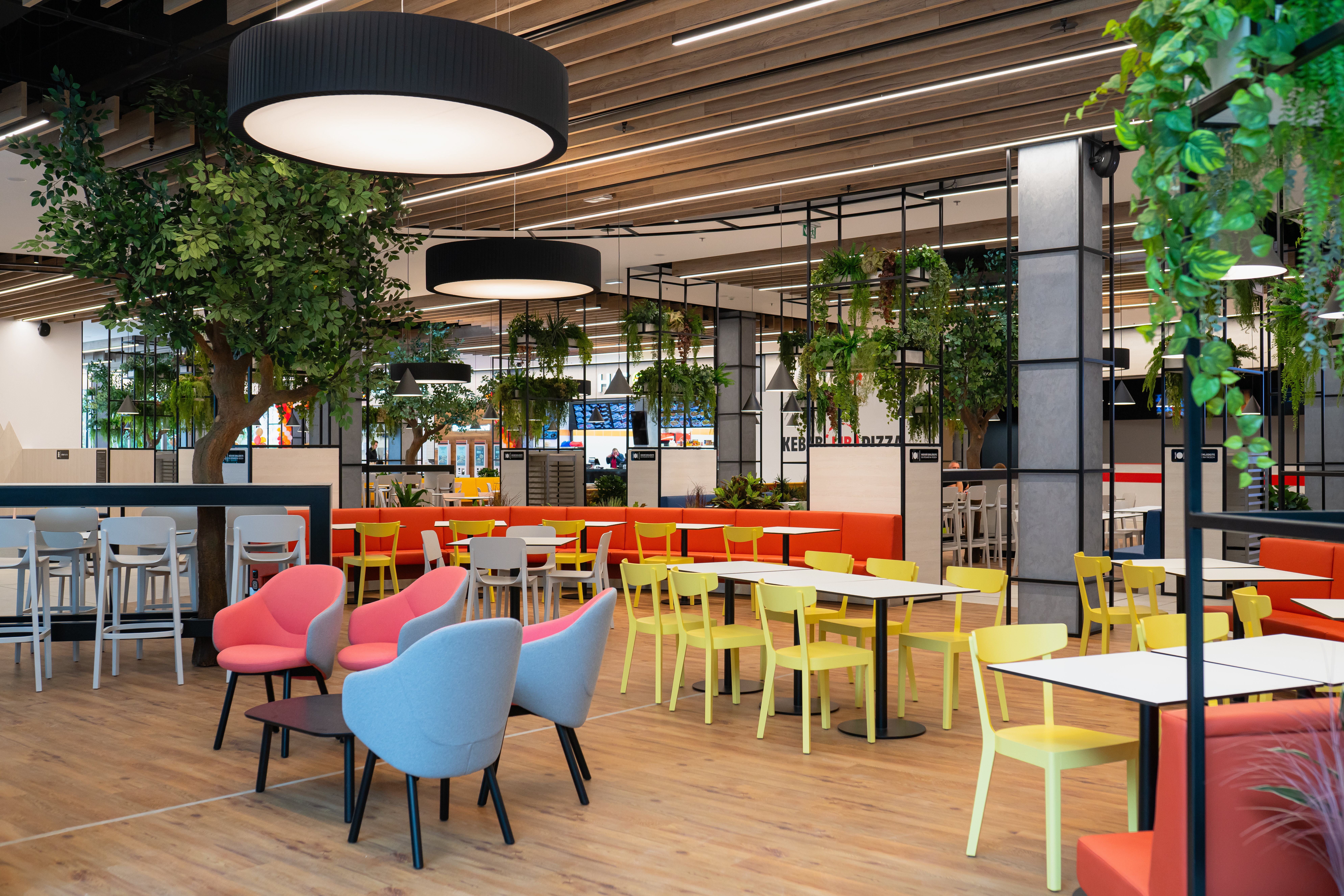 Vybírejte z široké nabídky jídel a nápojů. Společně s dobrým jídlem si užijte také krásné a moderní prostředí, které bylo navrženo tak, aby vám poskytlo maximální pohodlí a relaxaci. Usaďte na barevných pohovkách nebo židlích, využijte bezplatné wifi připojení, dobijte si mobilní telefon na dobíjecích stanicích nebo se pobavte s dětmi v dětském koutku.