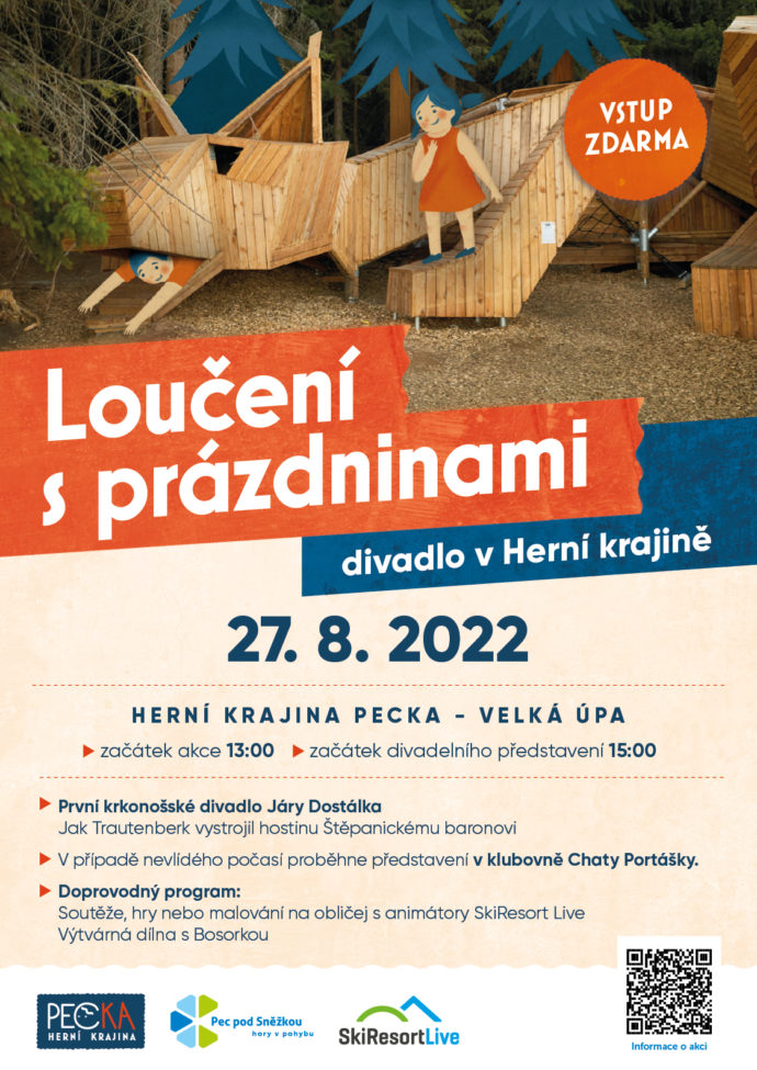 Máme pro vás tip, jak strávit poslední prázdninový víkend. Zveme vás na výlet do Herní krajiny Pecka, kde na vás čeká, kromě dobrodružství v unikátním dětském hřišti na hřebenech Krkonoš, i zábavný odpolední program a divadlo pro děti. Vítejte na akci Loučení s prázdninami.