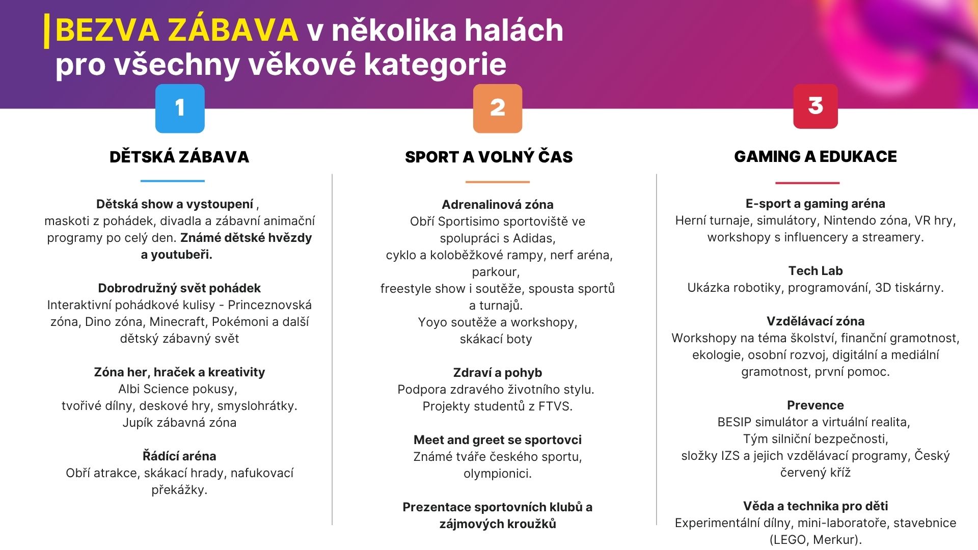 Doprovodný program pak rozšiřuje zážitek o celou řadu atrakcí a aktivit, které baví i inspirují. Návštěvníci se mohou ponořit do světa her v obří Nintendo zóně nebo gaming aréně, vyzkoušet si vědu v praxi díky science show s iQLANDIÍ nebo si osvojit důležité dovednosti v kurzech první pomoci či v zóně silniční bezpečnosti.