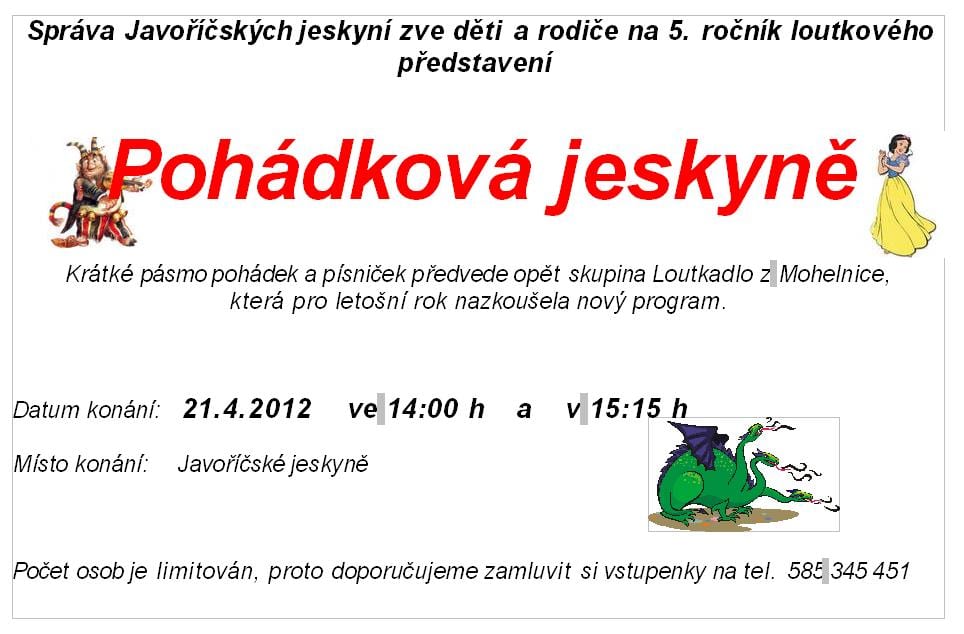 Správa Javoříčských jeskyní zve děti a rodiče na 5. ročník loutkového představení Pohádková jeskyně. Krátké pásmo pohádek a písniček předvede opět skupina Loutkadlo z Mohelnice, která pro letošní rok nazkoušela nový program.