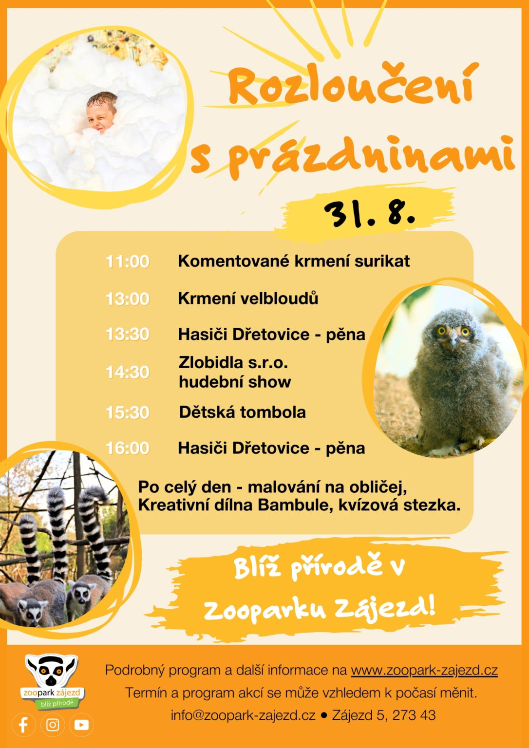 V sobotu 31. srpna se rozloučíme s prázdninami! Na děti čeká kopa zábavy a odměn. Těšit se můžete na hudební show od Zlobidla s.r.o., SDH Dřetovice s ukázkou techniky a pěnou, dětskou tombolu o parádní ceny, krmení velbloudů, komentované krmení zvířat, malování na obličej, kvízovou stezku a dílničku pro děti. Program bude opravdu nabitý!