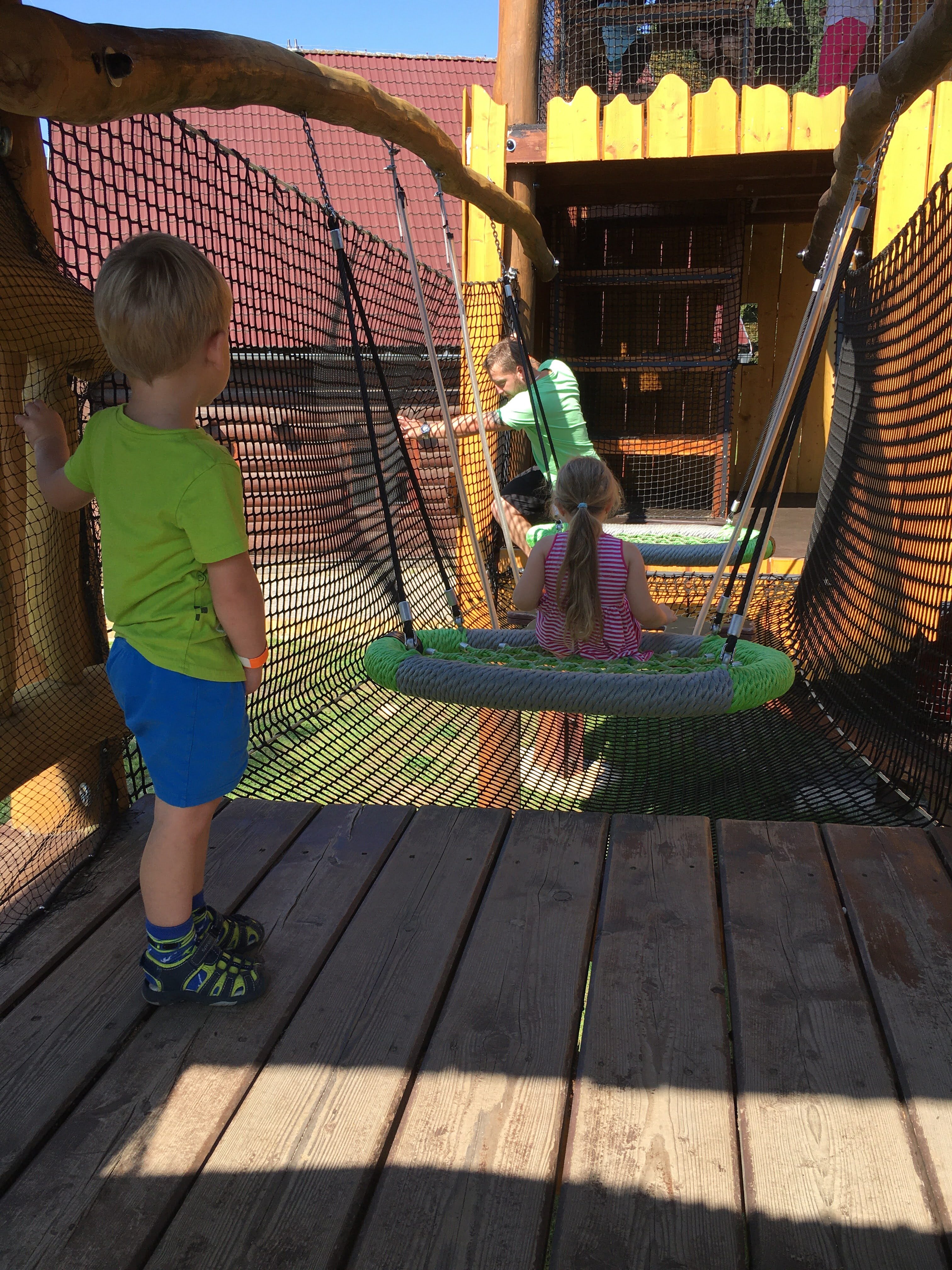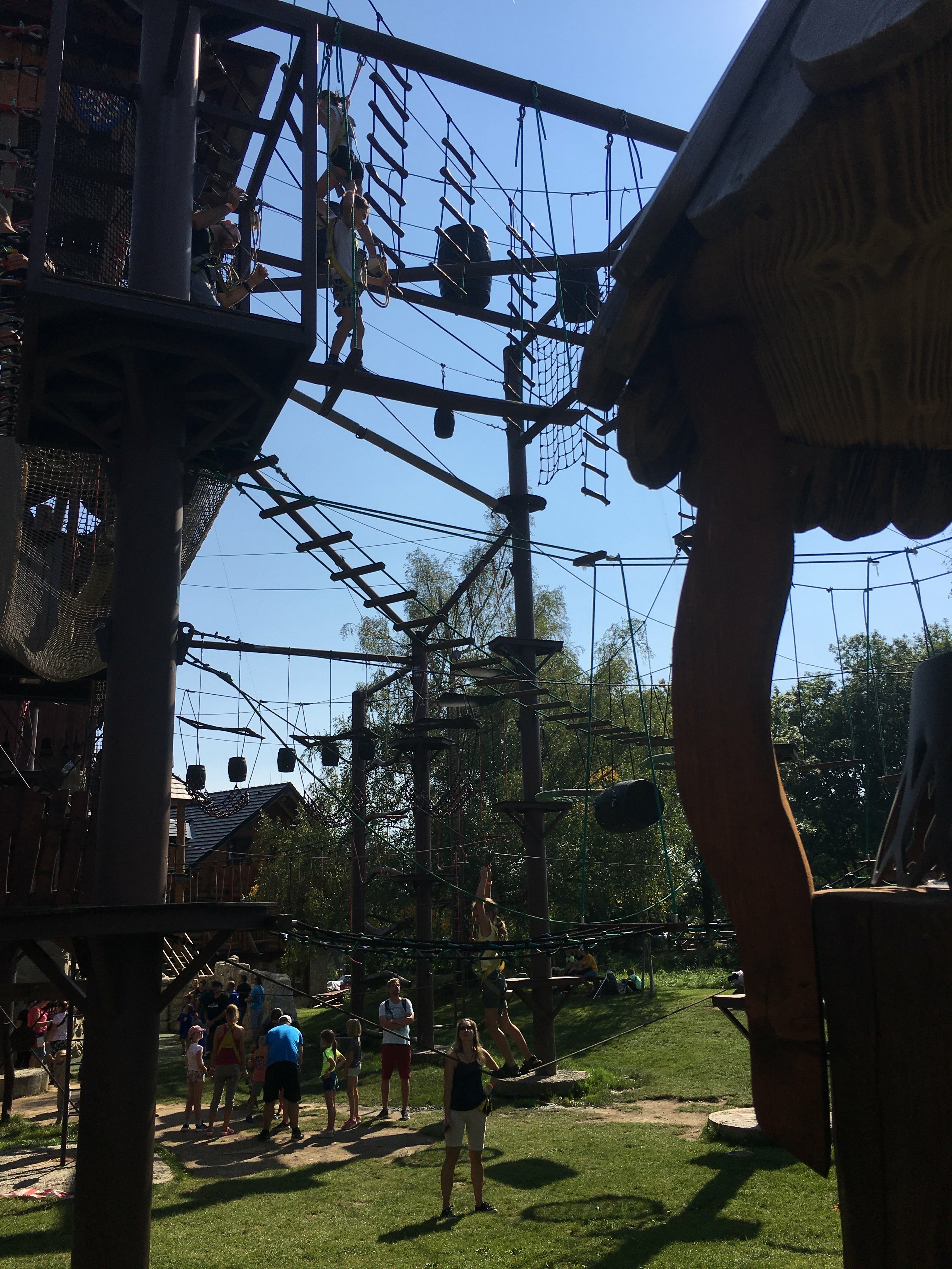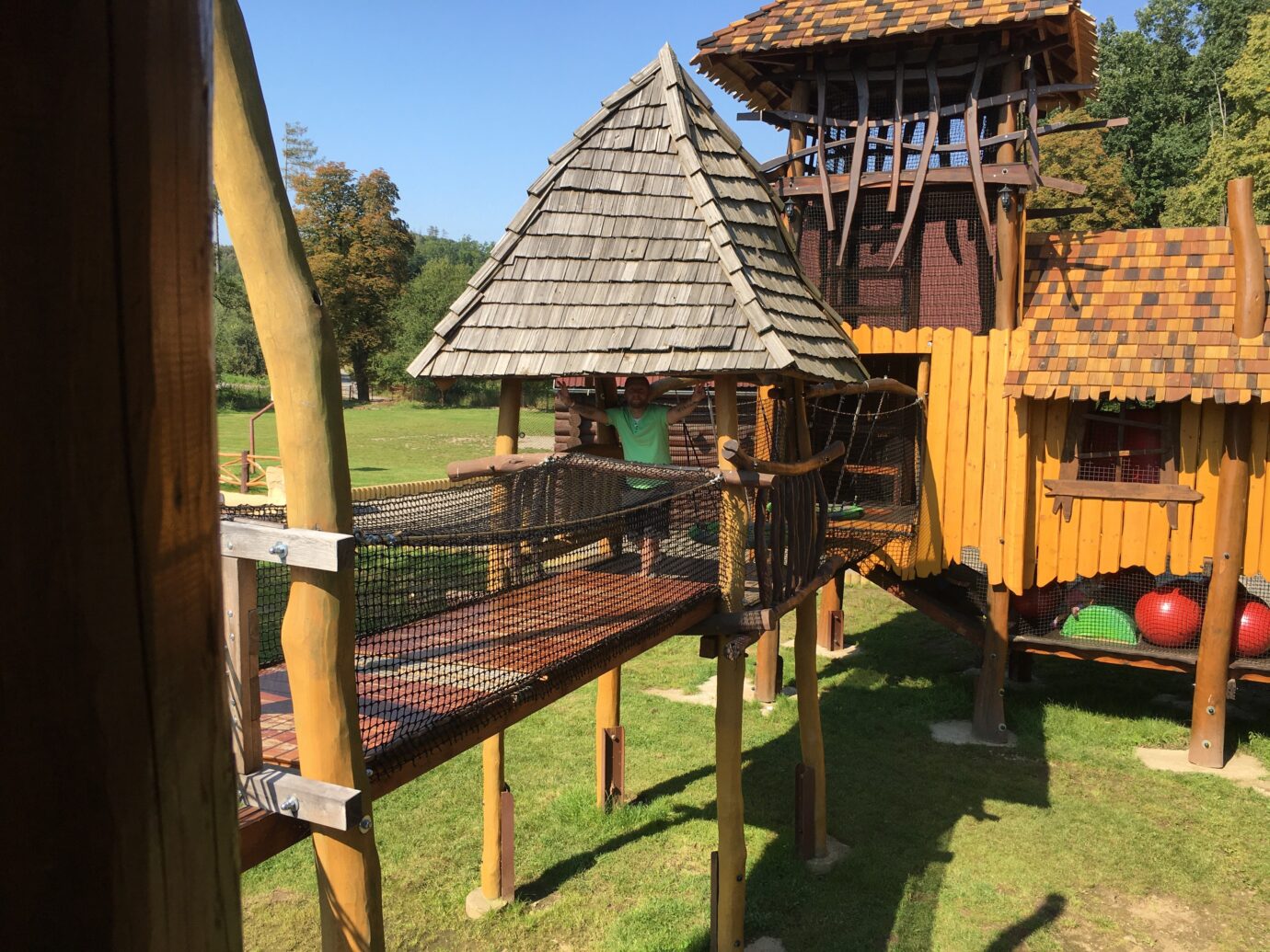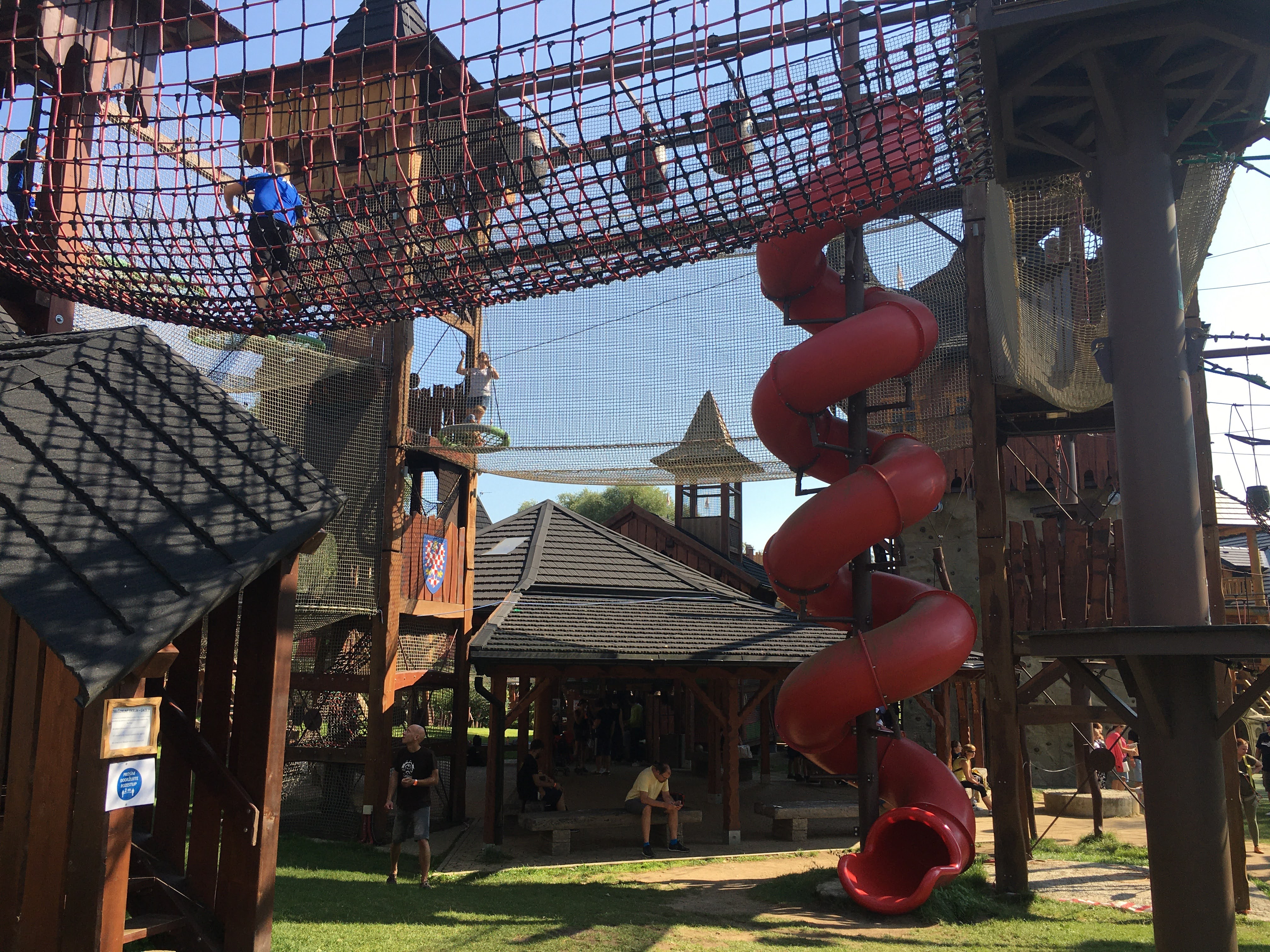Snad největší úspěch u našich dětí měl velký lanový park v podobě hradu s několika věžemi. V mapě resortu jej najdete pod názvem Vysokolanové centrum. Nemusíte se však bát. I když se většina prolézaček nachází ve vysoké výšce, vše je zajištěné sítěmi, takže případný pád není nebezpečný. Nemusí však dělat dobře lidem, kteří nemají rádi výšky a vadí jim, když pod sebou mají síť, skrz kterou vidí až dolů na trávu. Najdete zde i skluzavky a tobogány.