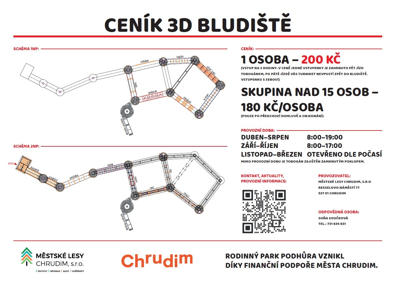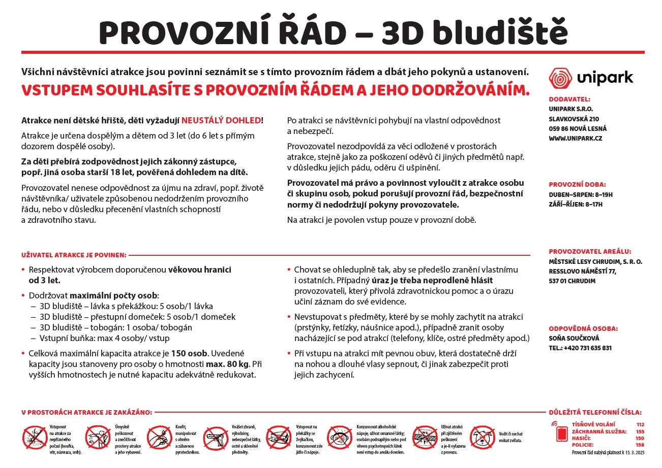Provoz bludiště je organizován tak, aby byla zachována komfortní kapacita a maximální bezpečí. Celý areál je limitován na 150 osob, přičemž jednotlivé domečky a lávky unesou pět návštěvníků najednou. Vstup je řešen turniketem a samoobslužnou pokladnou, která přijímá hotovost i platební karty. Jednorázová vstupenka umožňuje tři hodiny pohybu v bludišti a až pět průchodů přes vstupní turniket.