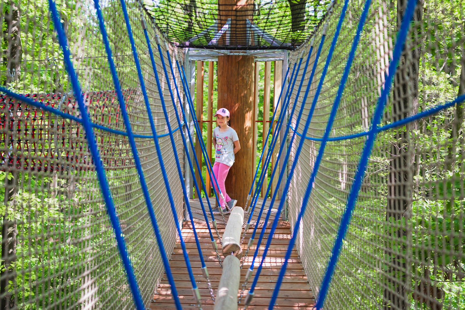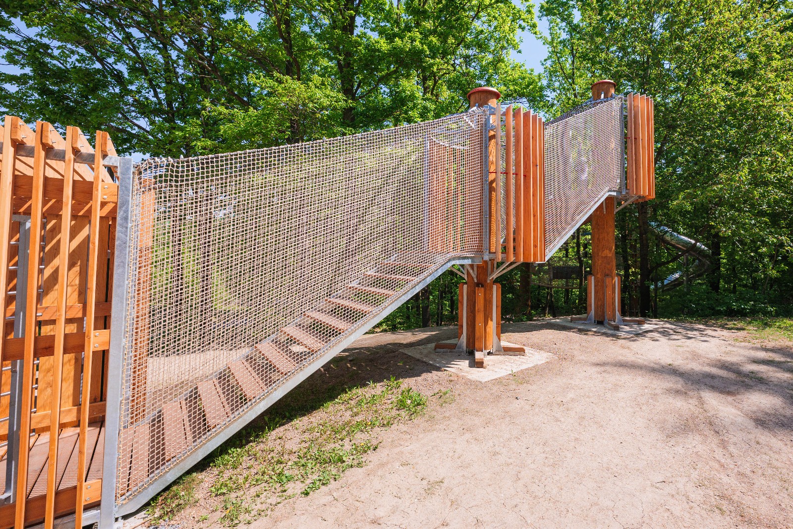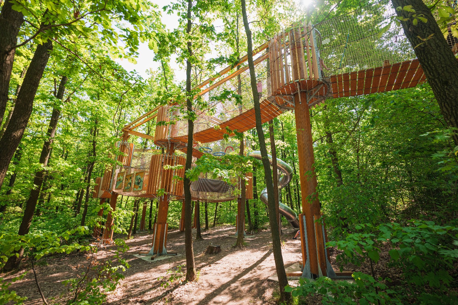 Lávky vedou dvěma úrovněmi a jednotlivé úseky nabízejí celou řadu pohybových prvků – od tunelů přes kladiny až po překážky inspirované pralesem či vojenským prostředím. Nechybí ani oblíbené dřevěné propadlo uvnitř domečku, které propojuje patra a přidává na dobrodružnosti. Na závěr čeká na každého adrenalinová jízda ocelovým tobogánem, který vás sveze zpět na zem z výšky šesti metrů.