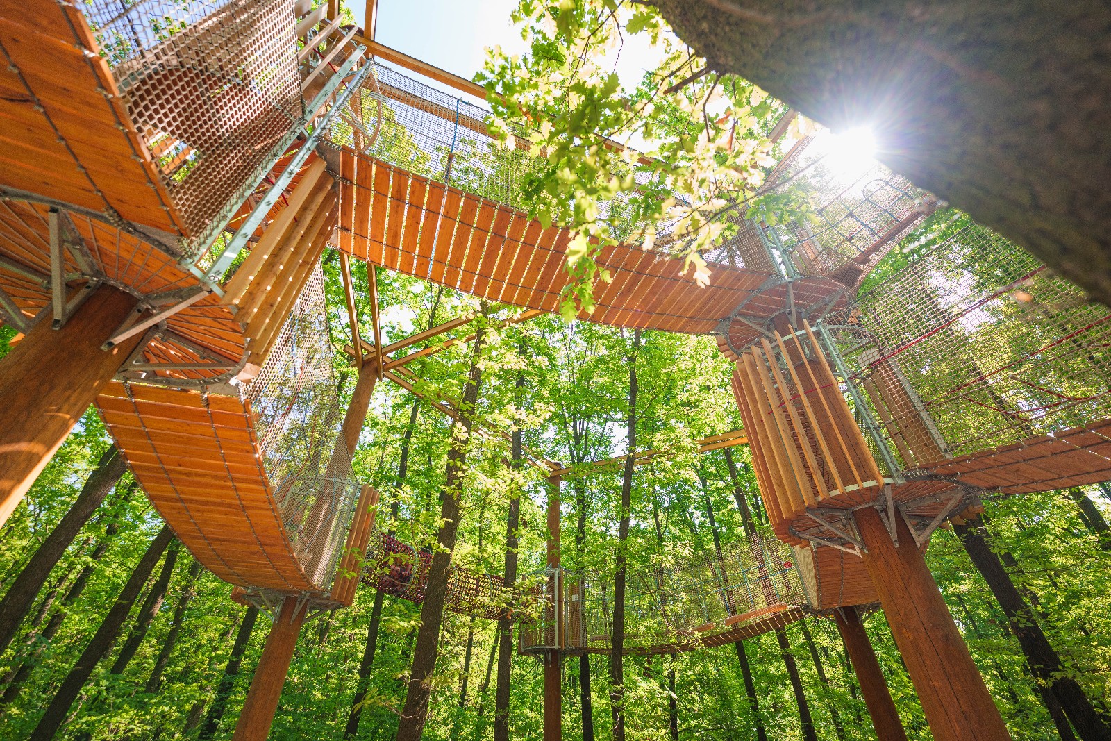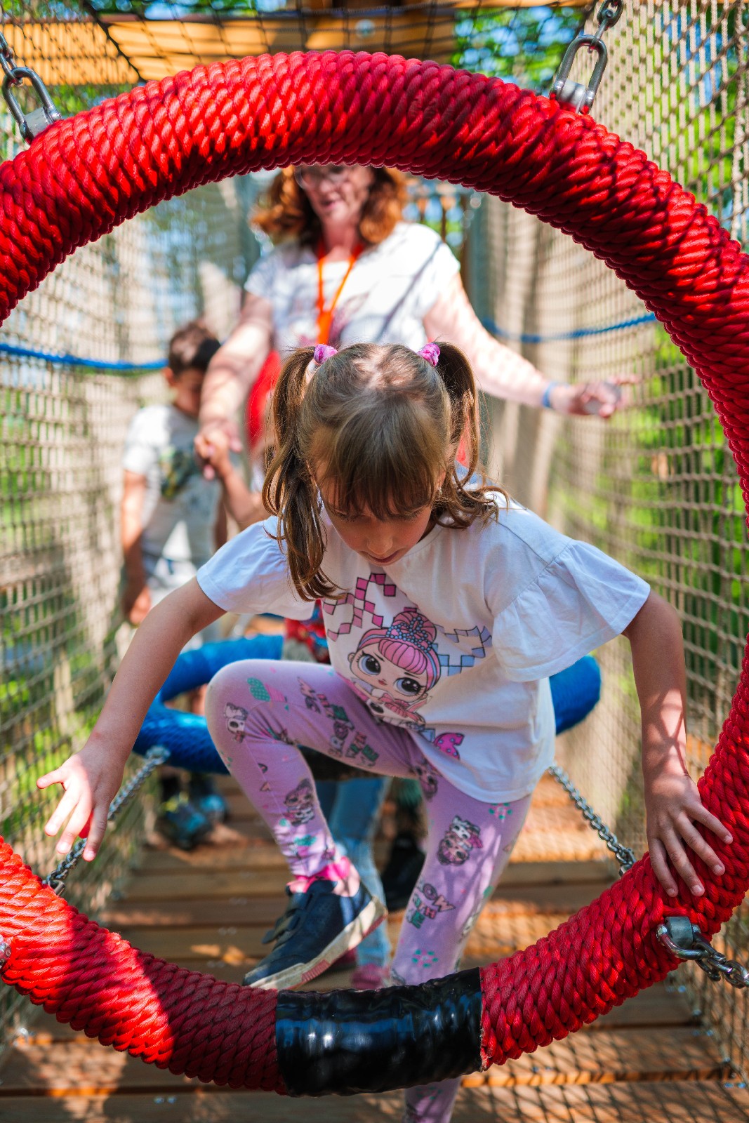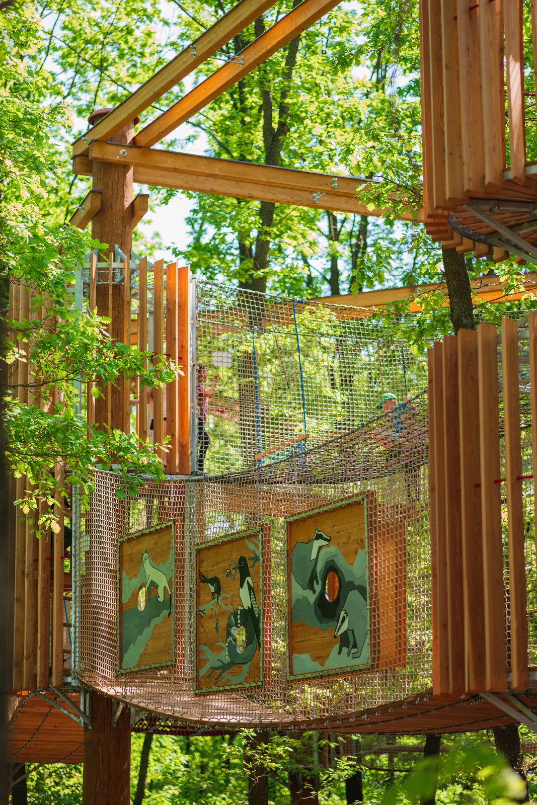 Lávky vedou dvěma úrovněmi a jednotlivé úseky nabízejí celou řadu pohybových prvků – od tunelů přes kladiny až po překážky inspirované pralesem či vojenským prostředím. Nechybí ani oblíbené dřevěné propadlo uvnitř domečku, které propojuje patra a přidává na dobrodružnosti. Na závěr čeká na každého adrenalinová jízda ocelovým tobogánem, který vás sveze zpět na zem z výšky šesti metrů.