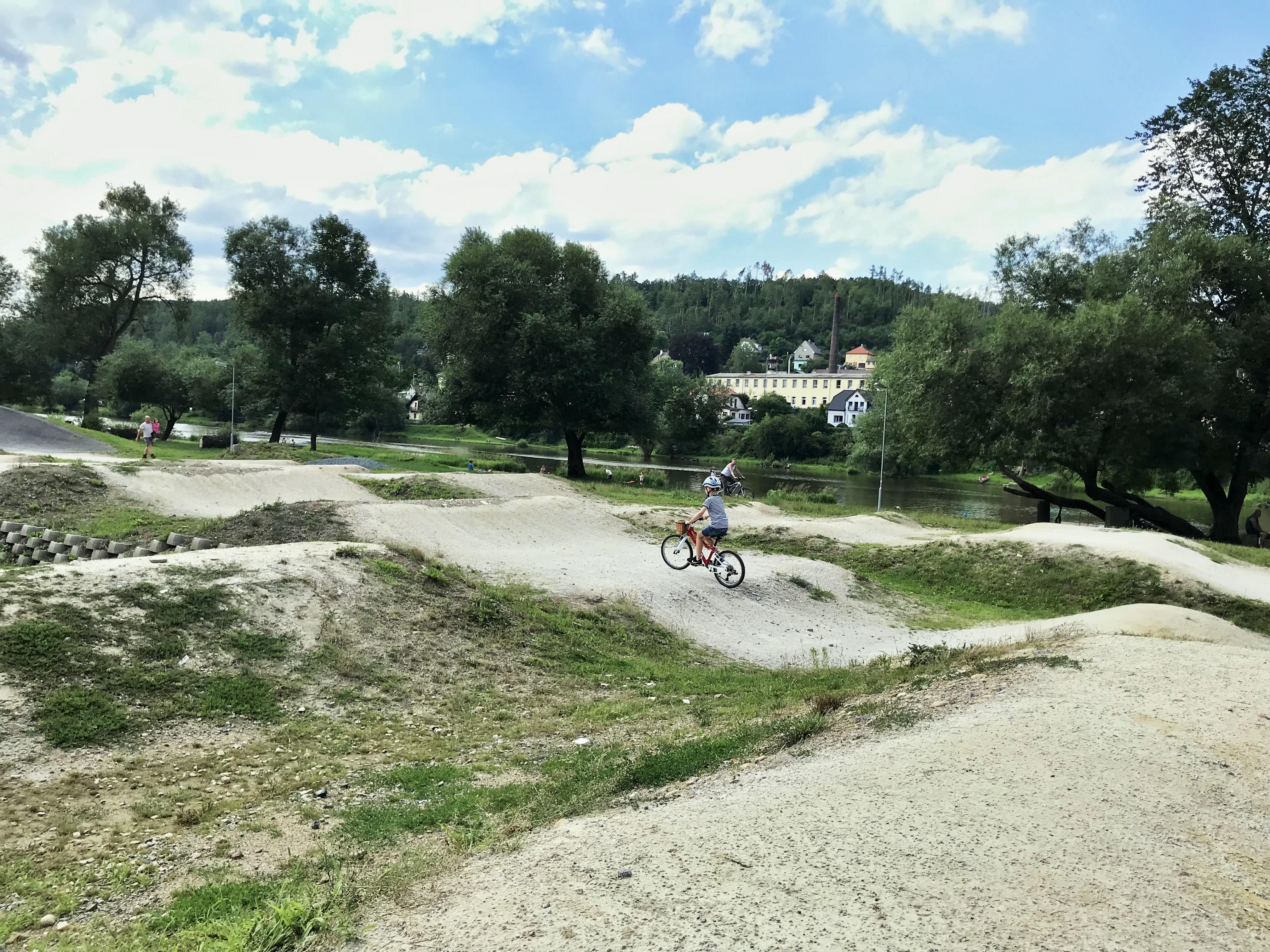Pumptrack v Nižboru jsme objevili zcela náhodou, ale už více jak tři roky si sem jednou za čas uděláme s dětmi výlet. Vezmeme jim kola do auta a už se jede. Pumptrack se nachází přímo u řeky a parkoviště je dole u mostu, na dohled od pumptracku. Je tu také velké dětské hřiště s malým bludištěm vysázeným ze stromků a keřů, které je také vítanou atrakcí. Děti chvíli jezdí na pumptracku, chvíli běhají po dětském hřišti a samozřejmě je láká i řeka Berounka, kterou lemuje cyklostezka a tak je možné se vydat i na krátký výlet podél řeky a navštívit třeba již zmiňovanou Nádražní výletní restauraci Zastávka.