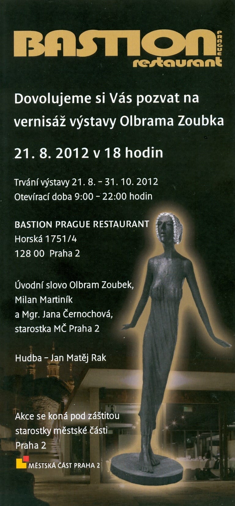 V prostoru obnoveného Bastionu XXXI Novoměstských hradeb bude v úterý 21. srpna 2012 v 18:00 zahájena výstava soch Olbrama Zoubka.