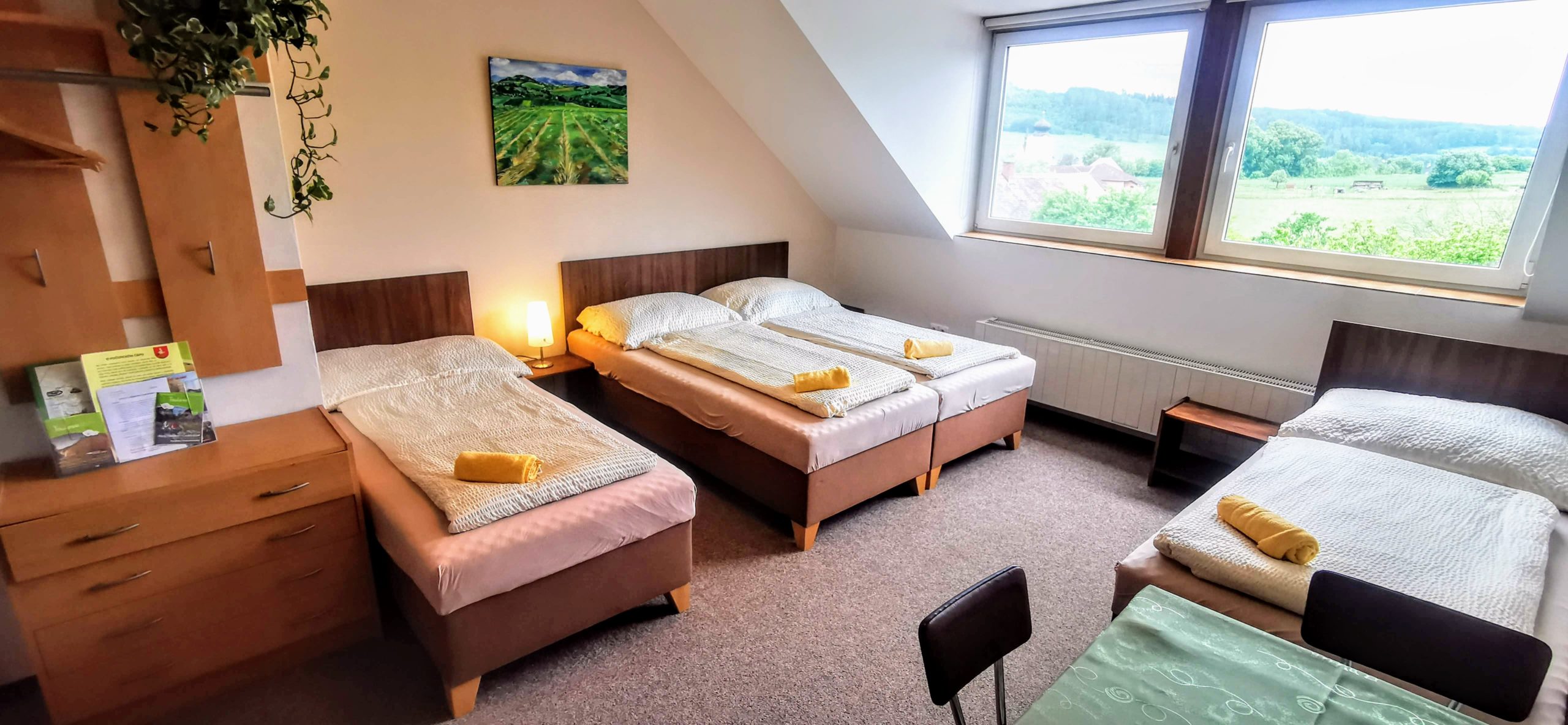 Ubytování si můžete zvolit podle vašich preferencí: v pokoji penzionu, v rodinném apartmánu s kuchyňkou, nebo v samostatném srubu.