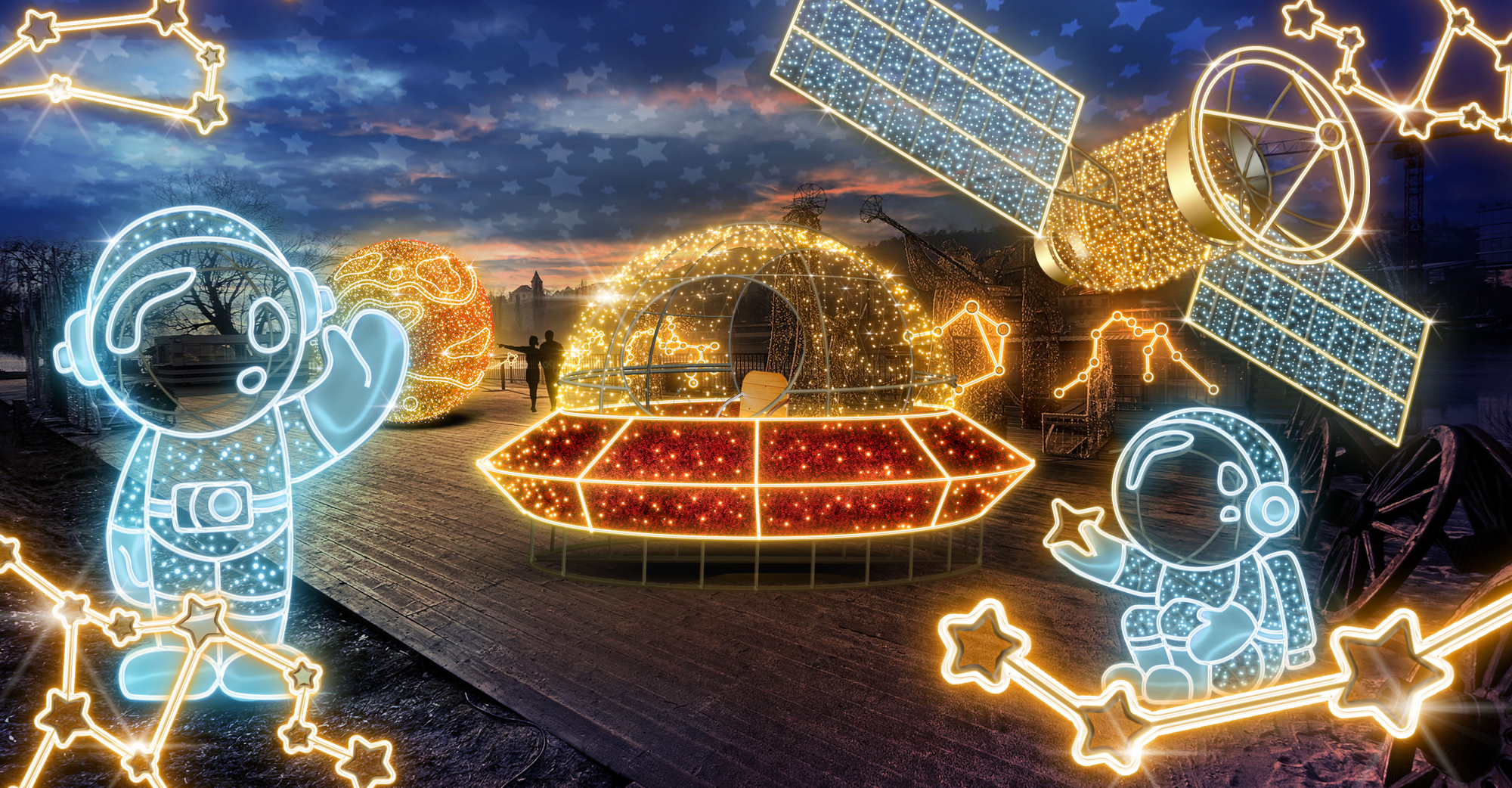 Projděte se mezi světelnými planetami sluneční soustavy, které dosahují až 5 metrů v průměru, a obdivujte úžasnou hvězdnou oblohu vytvořenou tisíci světýlky. Uvidíte Zemi, Jupiter, Saturn a další planety v obřích rozměrech, které vás uchvátí svou září.