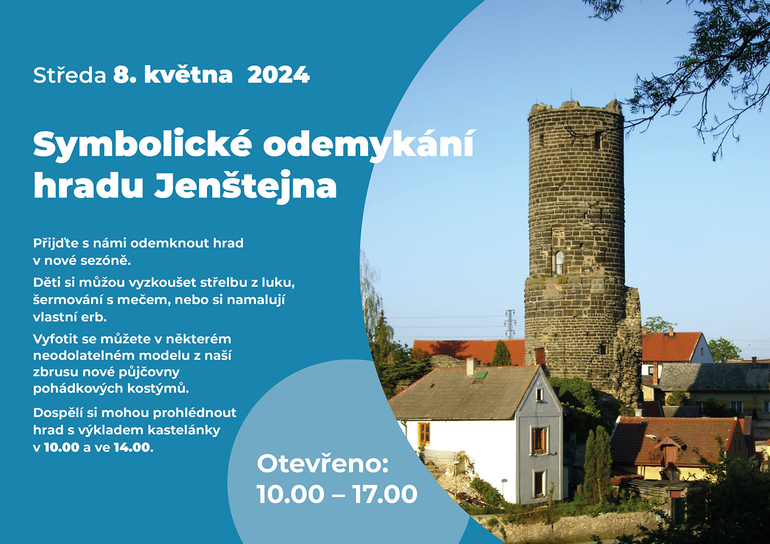 Přijďte s námi odemknout hrad v nové sezóně. Děti si můžou vyzkoušet střelbu z luku, šermování mečem, nebo si namalují vlastní erb. Dospělí si mohou prohlédnout hrad s výkladem kastelánky 10.00 a ve 14.00.